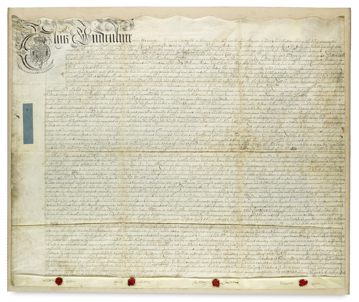 Manuscripts – Great Britain - Indenture. Large-format English parchment document with calligraphic incipit and coat of arms of the British royal house. With 4 seals. - With the signatures of William and Edith Acton, Anthony and Elizabeth London. - Foldmarks, edges slightly dusty, folds slightly browned, otherwise overall well preserved.