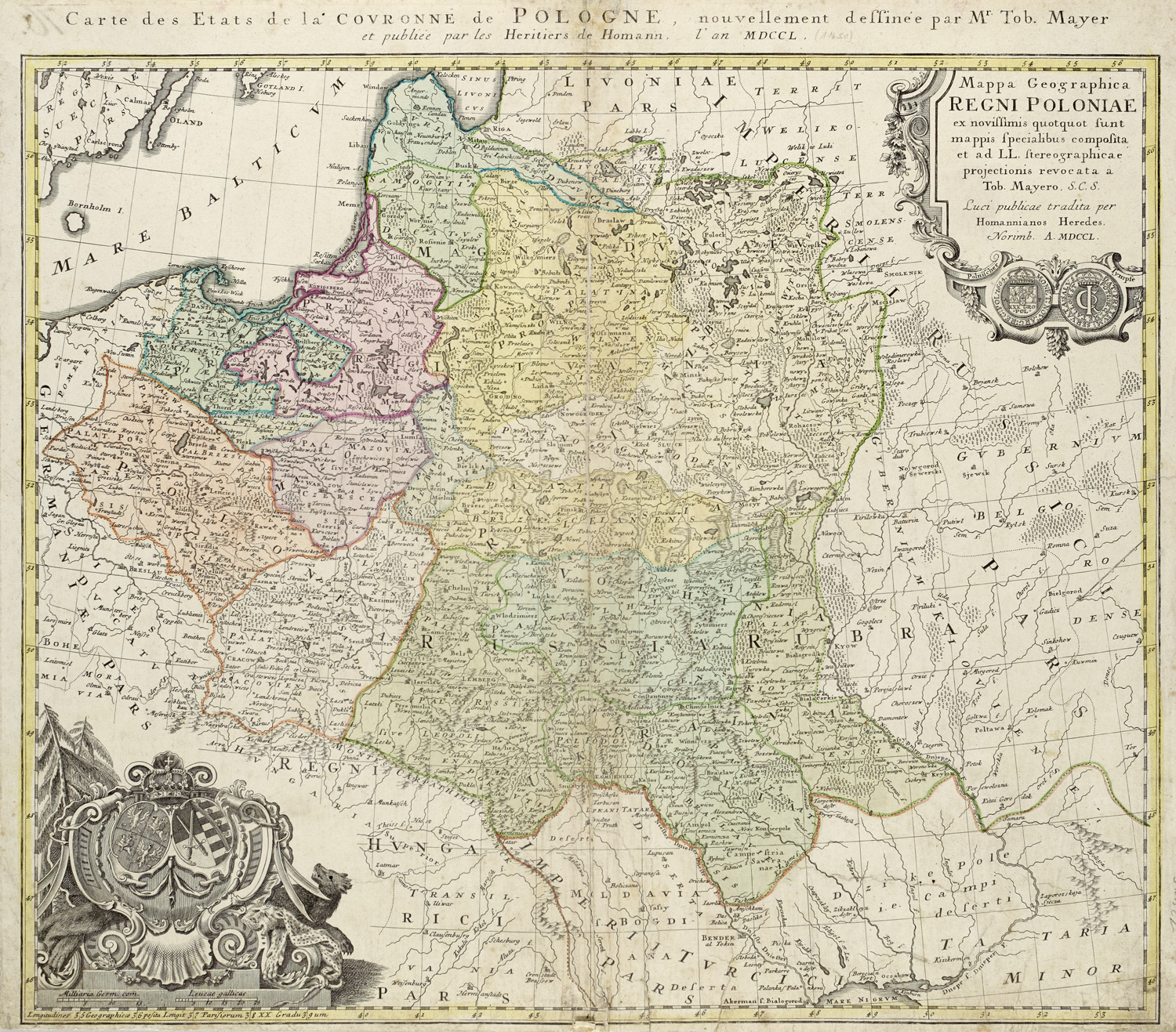 Carte des Etats de la'Coveronne de Pologne, nouvellement deffinée par Mr. Tob. Mayer (...). Mappa Geographica Regni Poloniae ex novissimis quotquot sunt mappis specialibus composita (...) Tob. Mayero, S.C.S. (...). 1750. Kupferkarte mit altem Grenz- und Flächenkolorit. 46 x 52 cm.
