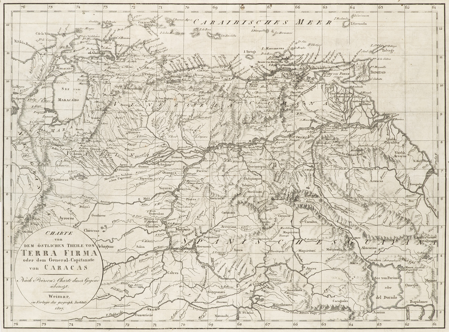 Historisch-geographisch-statistische Nachrichten von der General-Hauptmannschaft Caracas, oder dem östlichen Theile der spanischen Landschaft Terrafirma in Süd-Amerika. Mit 1 gest. gefalt. Karte. 2 Bll., XXXII, 488 S. 8°. Marmor. HLdr. d. Zt. mit goldgepr. RSchild (etw. bestoßen, Rückdeckel mit kl. Wurmspuren).