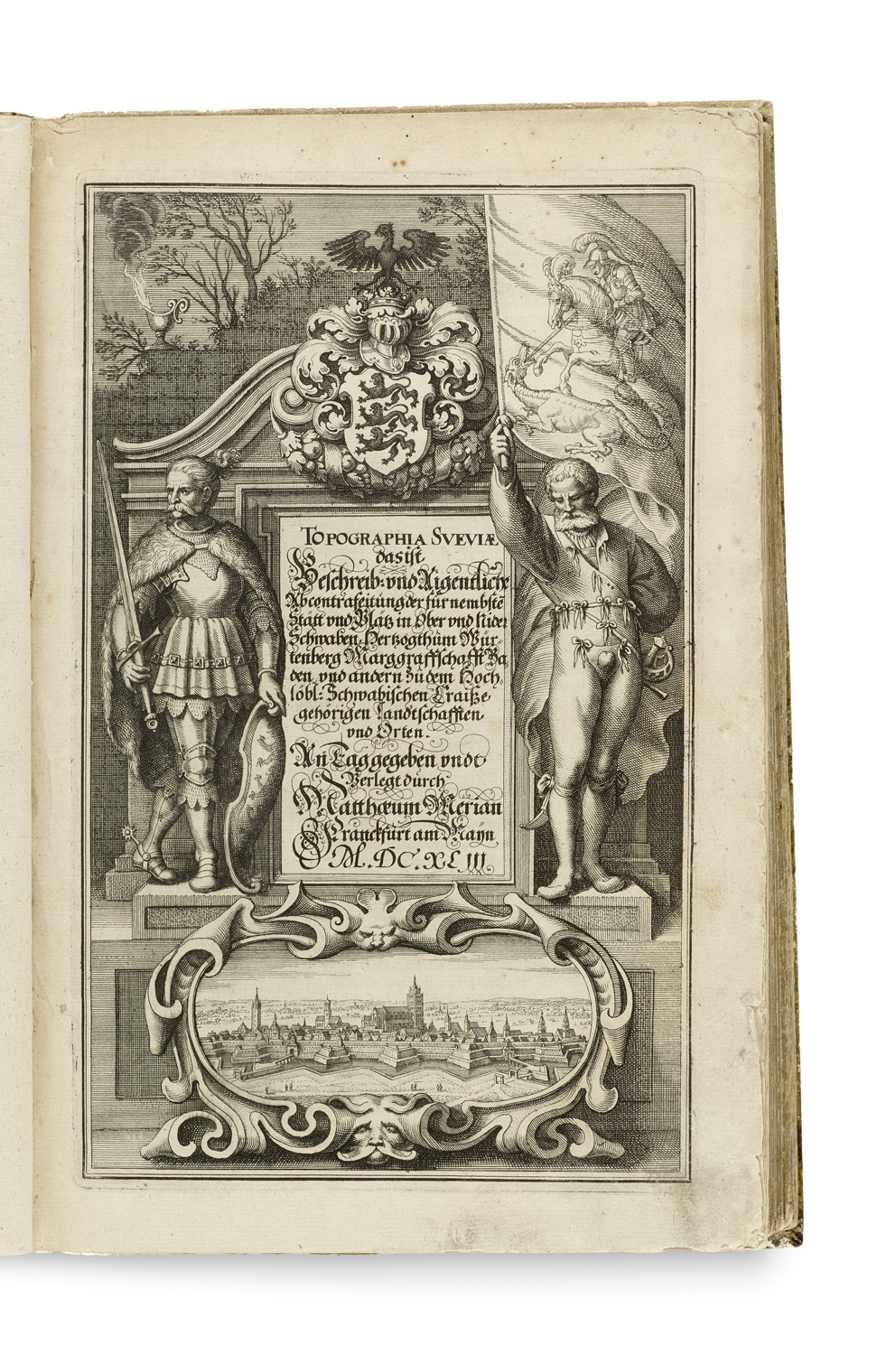 Topographia Sueviae, das ist Beschreib- und Aigentliche Abcontrafeitung der für nembste Stadt und Plätzn in Ober vnd Nider Schwaben, Herzogthum Würtenberg, Margraffschafft Baden und anderen zu dem Hoch-Löbl Schwabischen Craiße gehörigen Landschafften und Orten. 2 Teile in 1 Bd. Mit 44 doppelseitigen und 14 ganzseitigen Tafeln. Frankfurt a. M., Matthäus Merian, 1643 u. 1654. 4 Bll., 100 S., 6 Bll., 127 S., 6 Bll. 4°. Pgt. d. Zt. mit reicher ornamentaler Blindprägung, zentralem Mittelstück und hs. RTitel (stark berieben und bestoßen, fleckig).
