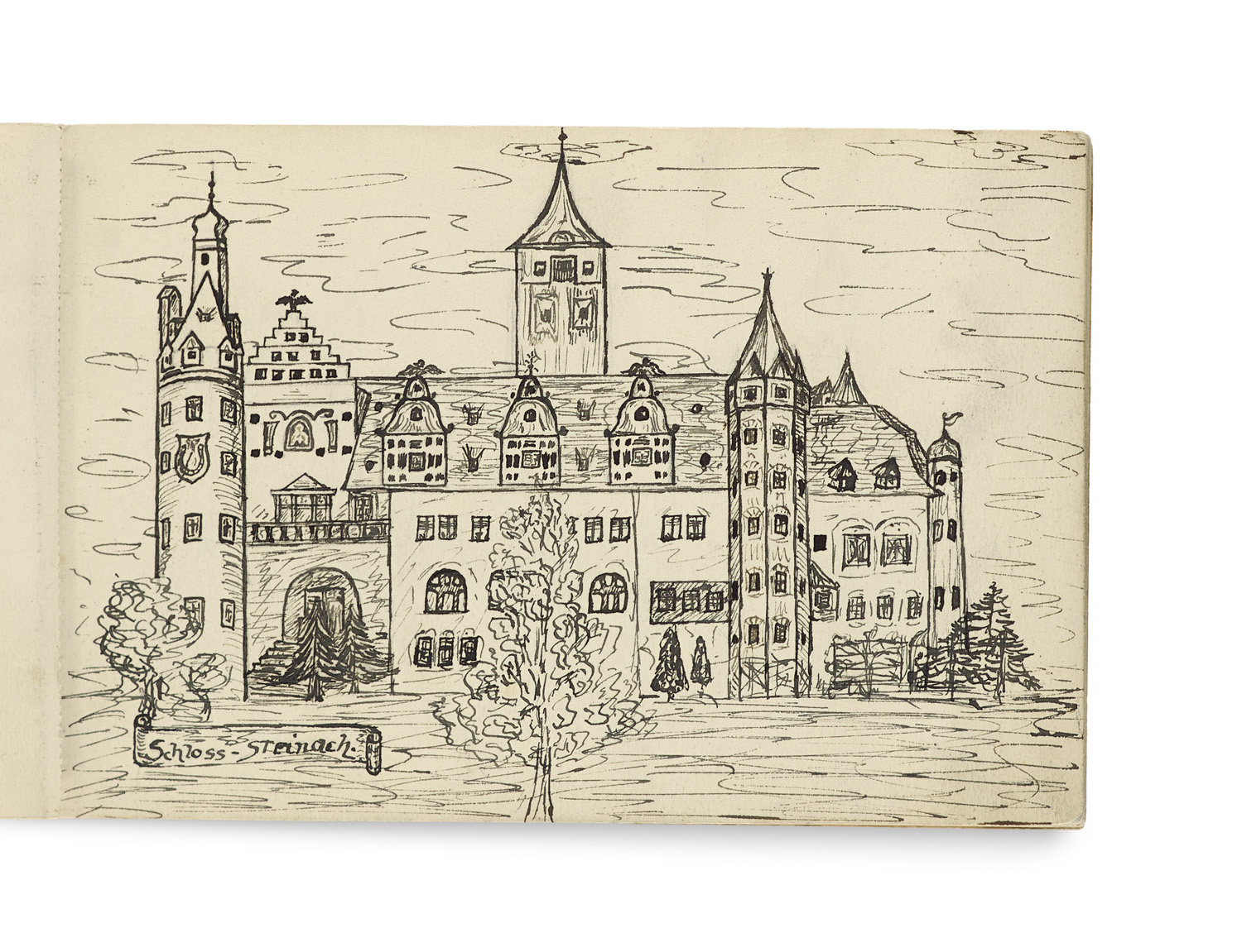 Local and Regional Studies – Bavaria - Sketchbook with 13 signed or monogrammed pencil and ink drawings, watercolours and sketches. 1917-1925. Cardboard with paper cover and ownership inscription 'Winkler Fr.' (spine with defects, stained, bumped). - Shown ares views of Steinach Castle, Nuremberg (marshalling yard, Pegnitz section from Henkersteg, Herz Jesu Church), Neumarkt i.O. (Wolfstein ruins), Arab, deer, dog, bouquet of poppies, etc. - Partly dated and inscribed. - 1 sheet loose, some fingerstains, otherwise in overall good condition.