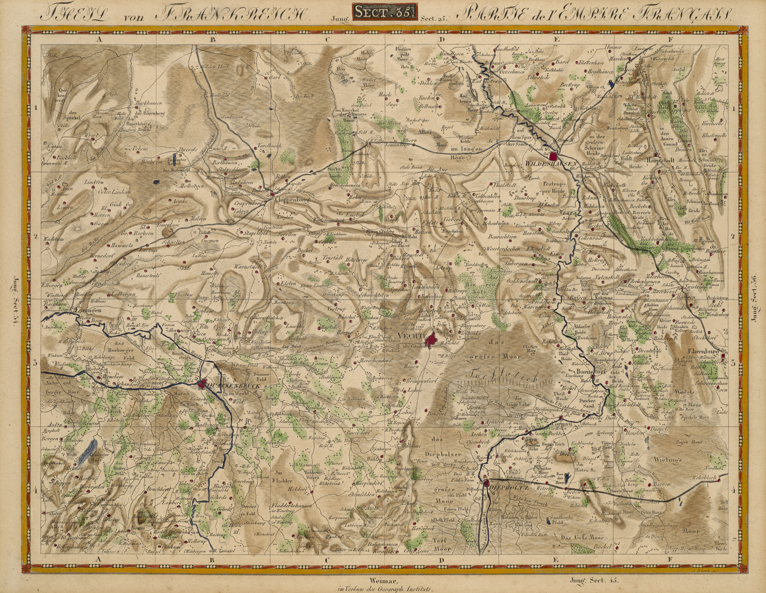 Orts- und Landeskunde mit verschiedenen Schlagworten – Enthält: - Johann Baptist Homann. Prospect und Grundris der Keiserl. Freyen Reichs und Ansee Stadt Bremen samt ihrer Gegend. Nürnberg, um 1720. - Cercles de Haute et Basse Saxe. Paris, Louis Charles Desnos, 1766. - Oldenburg Comitatus. Amsterdam, Schenk u. Valk, um 1700. - Die Grafschaft Hoya mit den Grafschaften Diepholz und Spiegelberg. Wien, Reilly, um 1790. - Theil von Frankreich. Partie de l'Empire Français. Sect. 35. Weimar, Verlag des Geogr. Instituts, um 1813. Mit Cloppenburg, Vechta, Wildeshausen und Quakenbrück. - Gustav Frank. Ansicht von Bremen. Um 1860. Getönte Lithographie auf Papier (sporfleckig durch früheren Wasserschaden). - Thomas Jefferys. The German Dominions of the King of Great Britain. Comprized under the name of Electorate of Brunswick-Luneburg and including the dutchies of Bremen, Verden, Luneburg-Zell, Calenberg and Grubenhagen. With the counties of Danneberg, Diepholt and Hoya, to which are added the dominions of Brunswick-Wolfenbuttel. London, Laurie & Whittle, 1794. - Episcopatuum Monasteriensis Et Osnabrugensis Ut Et Comitatuum Bentheim, Teclenburg, Stenford, Lingen, Diepholt, Delmenhorst, Rietberg. Augsburg, Seutter, um 1740. (mit mehrfachen geglätteten Falzen, diese teils mit Fehlstellen. Einige hs. Annotationen in Buntstift). - Je mit geglättetem Mittelfalz. Teils leicht gebräunt. Insgesamt wohlerhalten.