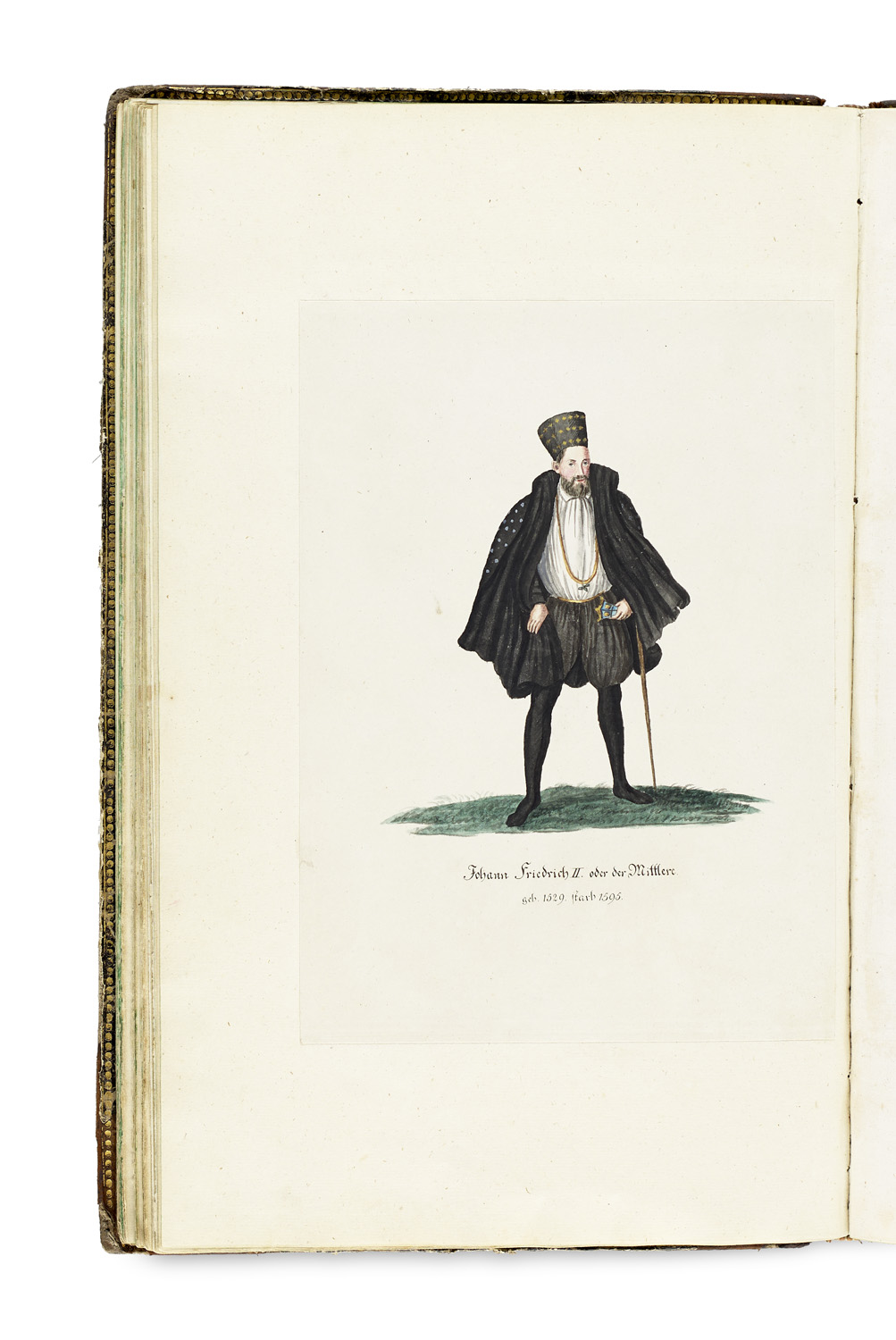 Local and Regional Studies – With 49 mostly colored plates, as well as a full-page engraved map and a map in the text. Half leather binding with mounted gold-stamped spine label and gilt inner edges, as well as colored edges (rubbed, heavily bumped, joints broken). - Rare. - First and only edition. - Hiller, 845. - With numerous portraits of the dukes and princes of Altenburg together with their spouses. The magnificently colored plates show the couples in the fashion typical of the time, each accompanied by a text about the respective ruler and, in some cases, the signature printed below the portrait. Among the rulers are Johann Friedrich II, Friedrich Wilhelm, and Ernst the Pious. - Plates mostly mounted. Stock stains, margins partly browned. Occasional handwritten markings. Overall in good condition.