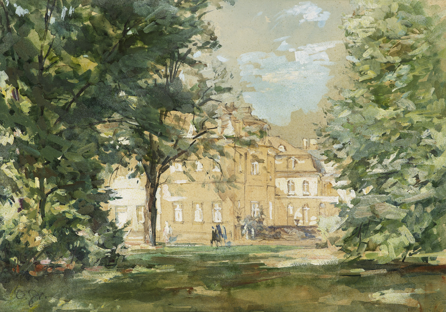 Prints and Engravings - Views – Watercolour and pencil on Schoellershammer wove paper (with dry stamp). Signed on the reverse and indicated on typographical label. Mounted under a passe-partout and framed under glass. - Varnished and yellowed, with slight brown spots on the reverse. Overall in good condition, colours fresh. - Our work is a side view of the west wing of the Baroque palace in Karlsruhe with a summery green area and trees with dense foliage in the foreground. The idyllic scenery is emphasised by atmospheric lighting and late Impressionist brushwork. Graeber attended the School of Applied Arts at the beginning of the 20th century and later the Grand Ducal Art School in Karlsruhe, which suggests that the motif depicted here was chosen from the immediate vicinity.