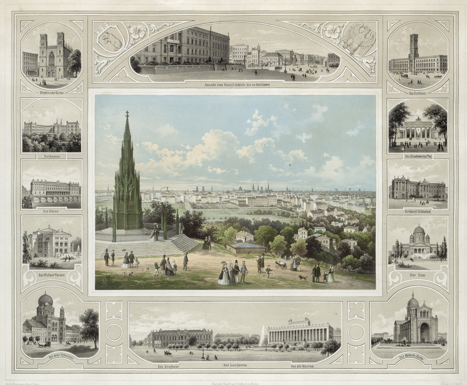 Dekorative Graphik - Ansichten – Sehr selten. - Souvenirblatt mit einer mittig kolorierten Ansicht von Kreuzberg umgeben von 12 nicht kolorierten Detailansichten: Ansicht vom Königl. Schloss bis zu den Linden, das Zeughaus zusammen mit dem Lustgarten und dem Alten Museum, Werdersche Kirche, Bethanien, die Börse, Wallner Theater, die Neue Synagoge, das Rathaus, Brandenburger Tor, königl. Bibliothek, (Berliner) Dom und die Michaels Kirche. - Leicht stockfleckig. Insgesamt gut erhalten.