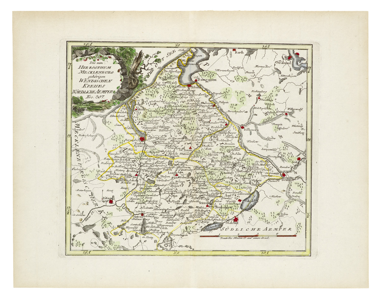Des zum Herzogthum Mecklenburg gehörigem Wendischen Kreises Nördliche Ämter. Um 1760. Kolorierter Kupferstich auf Bütten. 21,5 x 24 cm (28 x 36 cm). Mit dekorativer Kartusche und Maßstabsleiste.