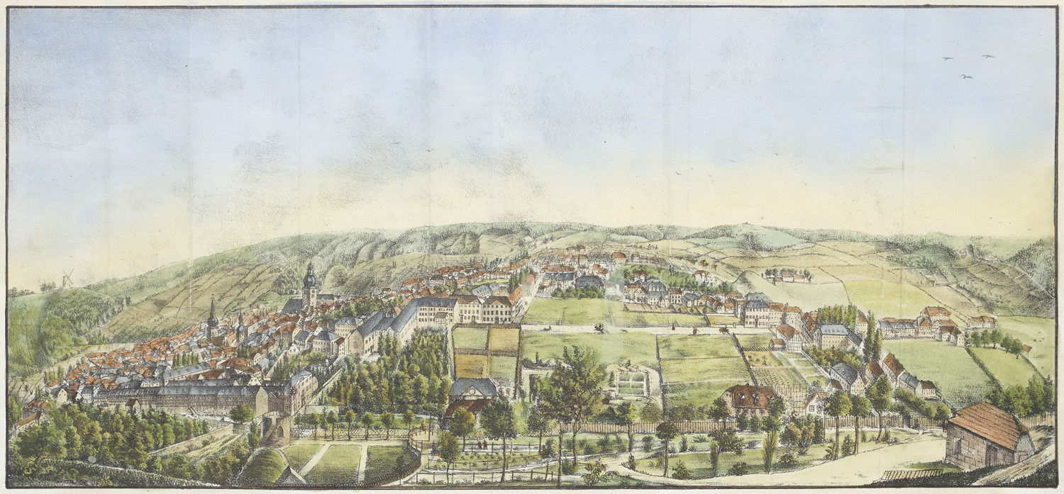 Prints and Engravings - Views – Colour lithograph on laid paper. Typographically inscribed in the margin. Mounted in places on backing paper and beneath a passe-partout with a gold border, and framed in a gold-coloured moulding (unframed). - This lithograph shows a panoramic view of the town of Elberfeld (now a district of Wuppertal) from the north-western outskirts. The lithograph was produced as an insert for the constitutional document of Elberfeld's mayor, J.R. Brüning, and documents the town at a time of growth: In the foreground, undeveloped land; in the middle ground, the foundation pit of St Laurentius Church (foundation stone laid in 1829). - Sheet appears to have slight marginal wear, isolated spots and partial rubbing. Overall, very good condition. Magnificent, chalky print.