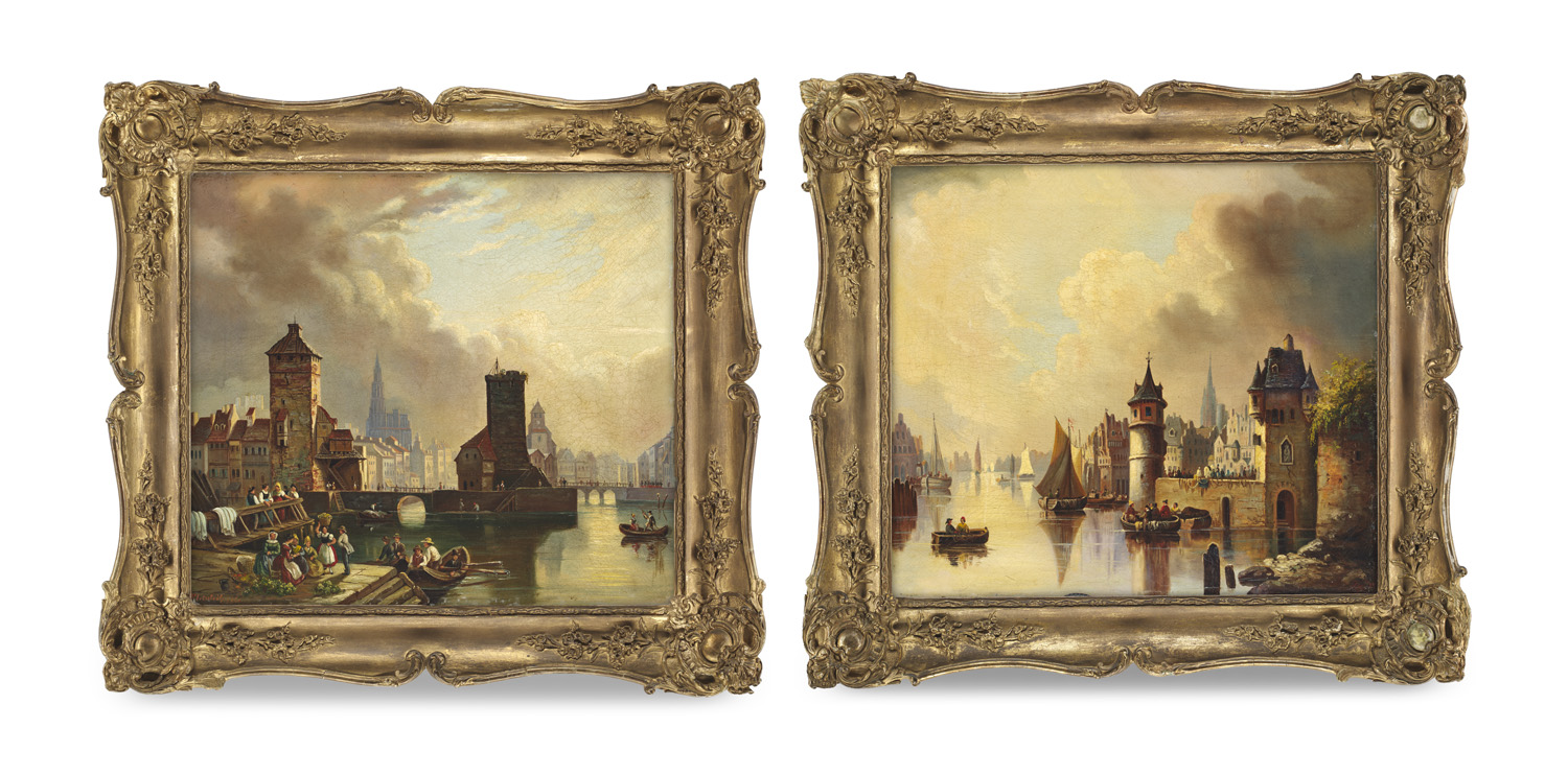 Prints and Engravings - Views – France - 2 works. Views of Strasbourg. 1860. Oil on canvas. One work signed and dated, one work monogrammed. Uniformly and decoratively framed in gilt stucco frames by Louis Wellhöfer (with label). - Franz Wilhelm Leuteritz, a self-taught landscape painter of the 19th century, primarily painted landscapes that are characterized by their atmospheric, naturalistic style and influenced by the Romantic ideal of landscape painting. Despite his lack of academic training, his works demonstrate a keen sense of composition, light, and atmosphere. - Fine craquelure due to age, varnish slightly yellowed, partial rubbing and small paint flaking in the frame area, occasional professional retouching. Overall good condition. Finely executed, idyllically lit cityscapes.