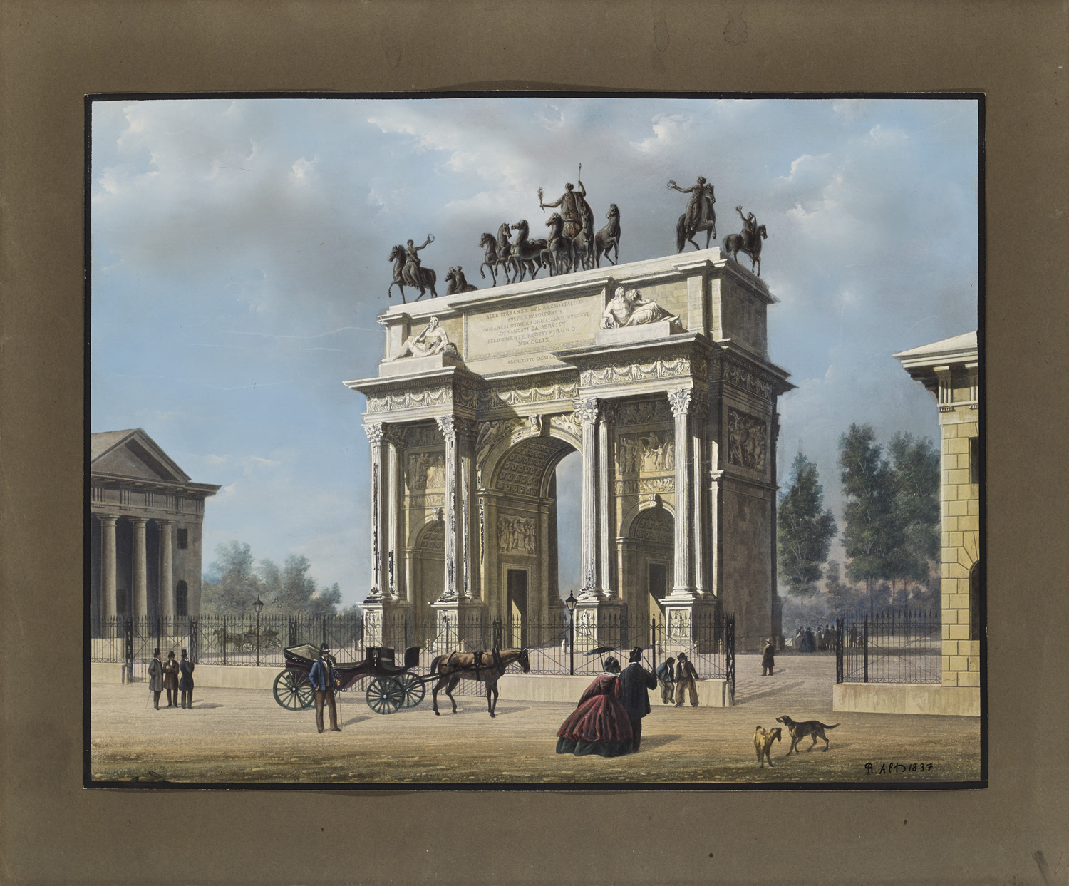Prints and Engravings - Views – Italy - Arco della Pace in Milan. Hand coloured lithograph. Signed 'R. Alts' and dated in the lower right. Mounted on card. - Occasional slight superficial streaks, cardboard slightly stained and somewhat light-edged. Overall in good condition.