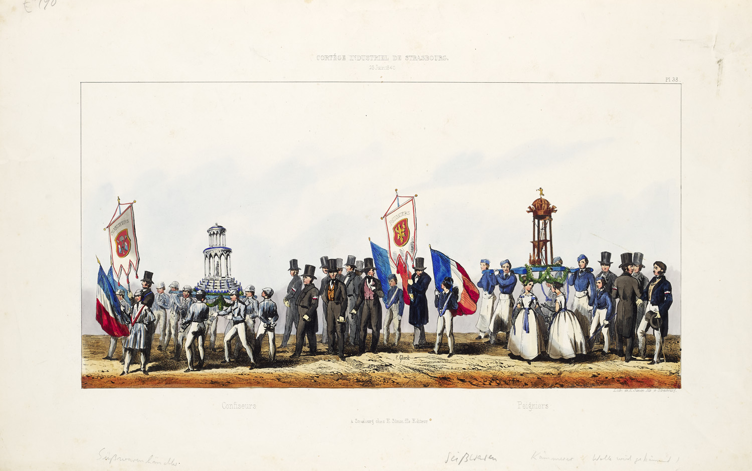 Prints and Engravings - Views – 27 coloured lithographs. 23 sheets mounted in spots on support and under passepartout. - 27 hand-coloured lithographs documenting the ceremonial "Cortège industriel" (industrial procession) as part of the Fêtes de Gutenberg. Various craft and trade guilds presented themselves in a parade, with each guild or profession grouped around a symbolic object or tool that represented its specific knowledge or field of activity. - Contains among others: Confiseurs/Peigniers - Lithographes - Tisserands - Typographes - Ferblantiers - Menuisiers - Tourneurs - Batliers - Tapissiers - Chaudronniers - Tailleurs - Papetiers - Bouchers - Peintres et Vernisseurs - Coiffeurs - Teinturiers - Tamisiers - Charpentiers. - Some pages with inscriptions by another hand, some more browned in the margins, here partly creased or with minor losses. Partly with pale foxing spots, verso with brown stains in places. Overall very good.