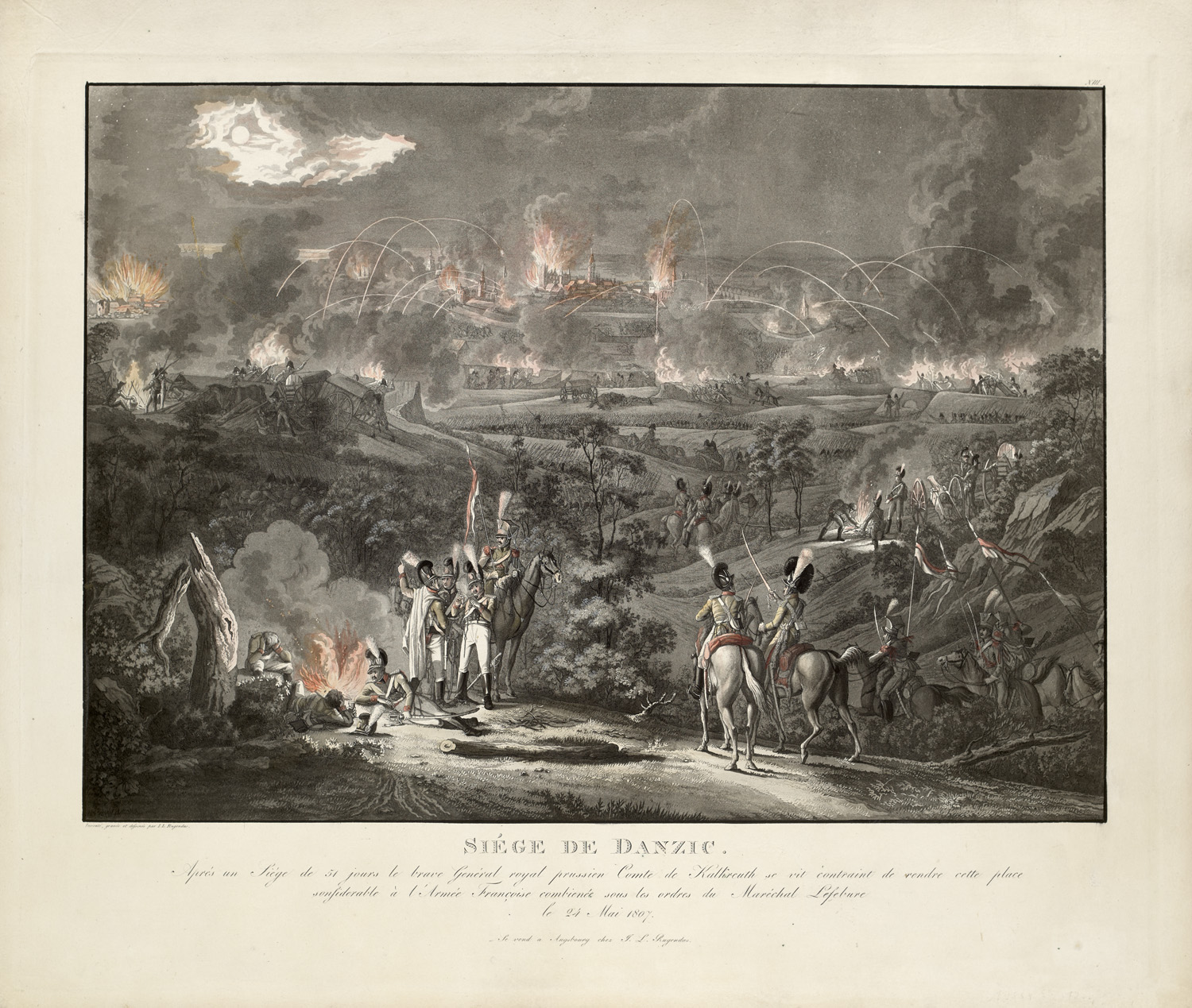 Dekorative Graphik - Ansichten – Blatt Nummer 13 von insgesamt 52 Blättern von Rugendas zu den napoleonischen Kriegen. Der vorliegende Druck stellt die Belagerung von Danzig da, die am 19. März 1807 begann und am 24. Mai 1807 mit dem Sieg der Franzosen beendet wurde. Die Aquatinta des deutschen Kunstverlegers und Historienmalers zeigt die nächtliche Beschießung der Stadt, welche bereits in Flammen steht. - Ränder leicht gebräunt, leicht fleckig. Insgesamt gut erhaltene, kontrastreiche Aquatinta.