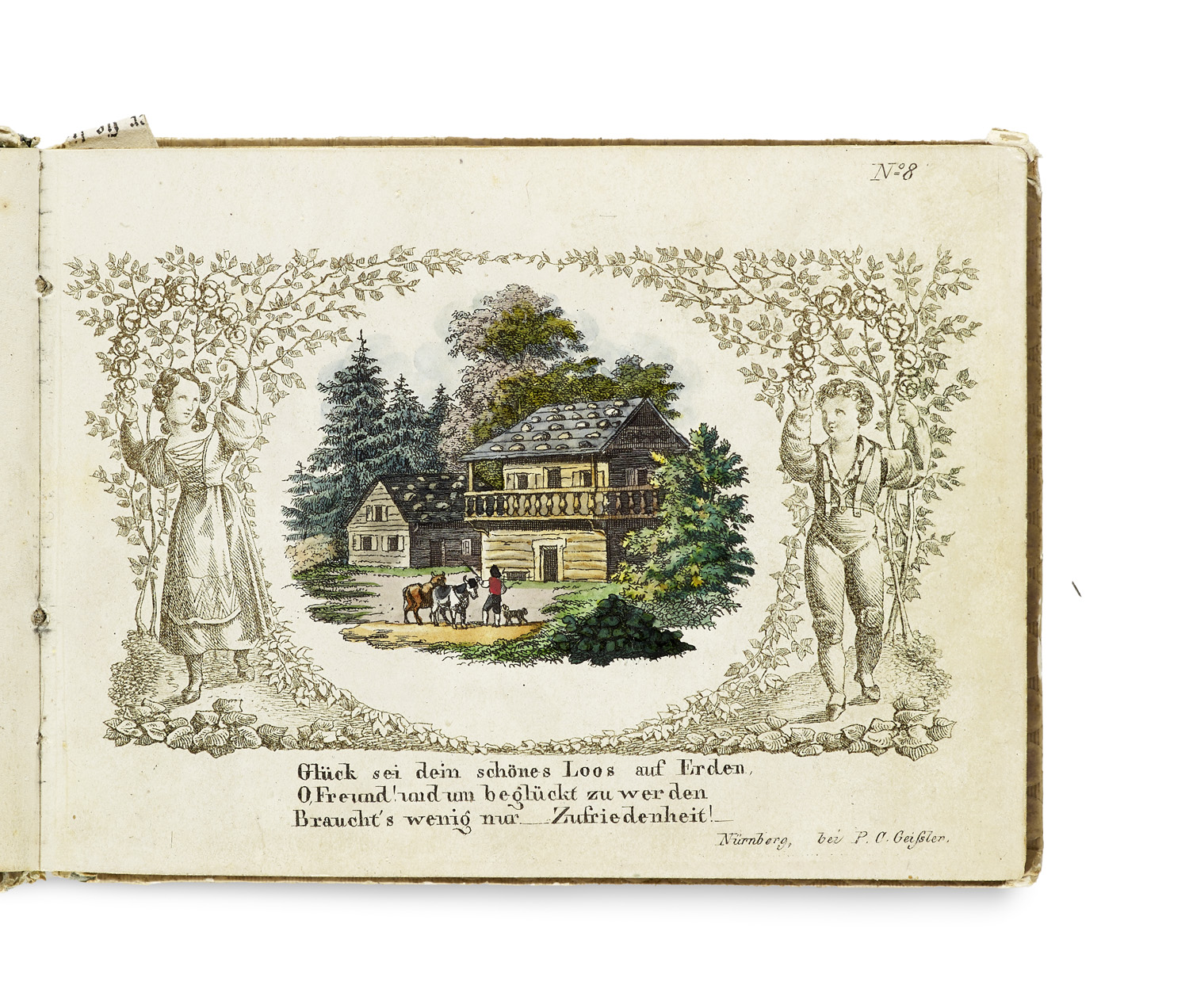 Manuscripts – Liber amicorum - Bavaria - Autograph book with 18 entries from Nuremberg. With 4 coloured engravings and 1 small ink drawing. Contemp. cardboard (rubbed, slightly bumped, top of spine with defect, spine chafed). - Entries, among others, by an aunt and friends as listed above. - Some brownstains, otherwise overall good.