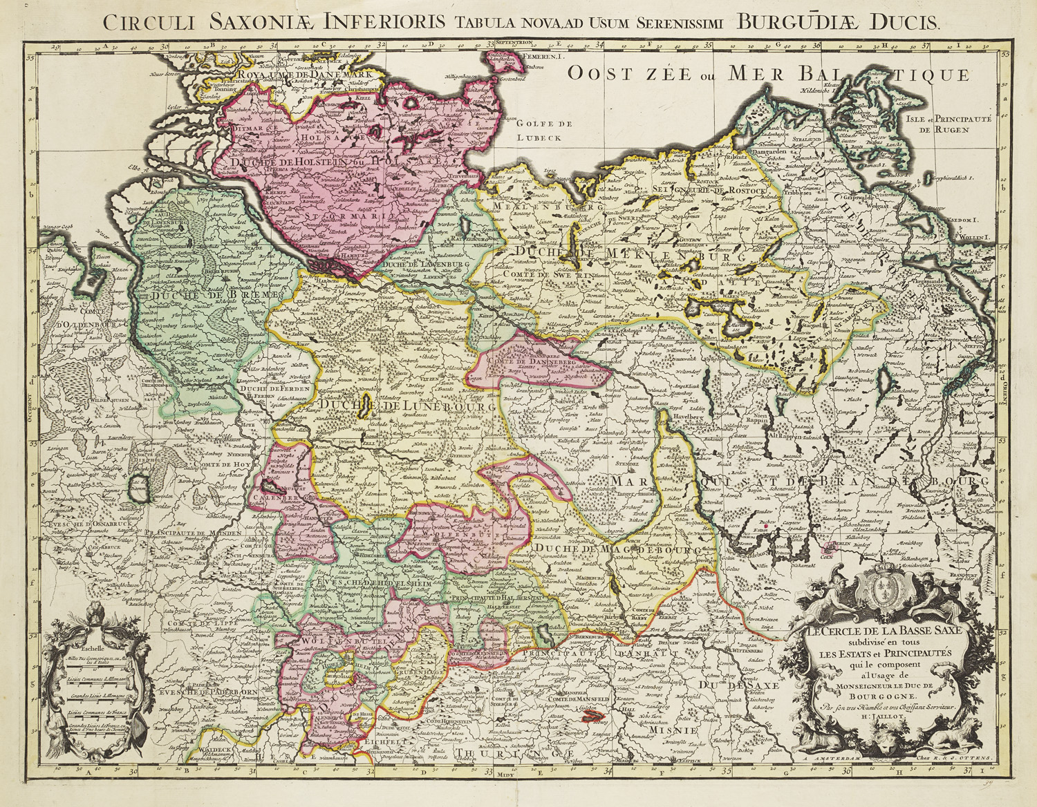 Dekorative Graphik - Karten – Enthält: J. Janssonius. Thuringae Nova Descriptio. Um 1633. Aus der deutschen Ausgabe des Mercator-Hondius-Atlas. - De Zetter. Episcopatus Halberstadensis descriptio nova. Um 1699. - Homann. Delineatio Geographica Territorii Celsissimorum S. R. I. Comitum Ruthenorum de Plauen utriusque Lineae Senioris nempe ac Iunioris partem Vogtlandiae. Um 1730. - Homann. Chorographia Territorii Naumburgocitiensis. 1732. - Jaillot. Le Cercle De La Basse Saxe subdivise' en tous Les Estats et Principautés (..). Um 1740. - P. Schenk. Accurate Geometrischer General Ris des Stiffts Merseburg. 1745. - P. Schenk. Accurate Geographische Delineation des Hochf. Sachß. Amtes Weissenfels. 1757. - P. Schenk. Accurate Geograph. Delineation Des Zu Dem Koenigreich Boehmen Gehoerigen Egerischen Creisses. 1757. - P. Schenk. Accurate Geogr. Delineation des zu dem Thüringischen Creis gehörigen Ammtes Eckardtsberga. Nebst allen daran grentzenden u. andern Gegenden. 1757. - Seutter. Delineatio Geographica Ditionis Martisburgensis (..). Um 1760. - P. Schenk. Tabula Geographica Principatus Halberstadiensis, Abbatie Quedlinburg, Comitatus Wernigerod ad statum novissimum revocata. Um 1760. - P. Schenk. Accurate geographische Delineation derer chursächischen Ammter Annaburg, Pretzsch, Torgau, Schweinitz, und Mühlberg (..). Um 1760. - Homann. Tabula Geographica sistens Territorium Liberae Sacri Romani Imperii Civitatis Svevo-Hallensis. 1762. - Papierbedingt insg. etw. gebräunt, tls. mit alten Sammlerstempeln u. Etikettenv verso, im Blattrand tls. etw. fingerfleckig, mit kurzen Einrissen (vereinzelt auch im Motiv), im Blattrand (u. vereinzelt im Motiv) partiell mit Feuchtigkeitsflecken, verso im Falz tls. hinterlegt. gering stockfleckig. Insgesamt wohlerhalten.