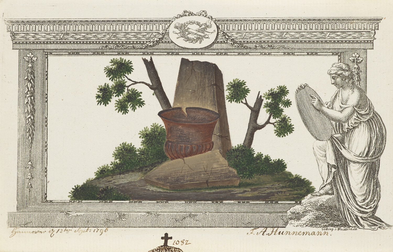 Manuscripts – Lower Saxony and Thuringia - Family von Pape. Collection of 81 album leaves with 1 ink drawing and 1 gouache for Heinrich Jobst von Pape with entries by some important personalities of the Goethe era. On engraved figurative preprints with border by Wiederhold in Göttingen. - Loose sheets with gilt edges in paper chemise in illustr. paper slipcase (rubbed, somewhat stained, joints and edges partly torn). - With entries from Gotha and Hanover, some Göttingen, by, among others, as listed above. - Very sporadically stained, one small marginal tear, overall well preserved.