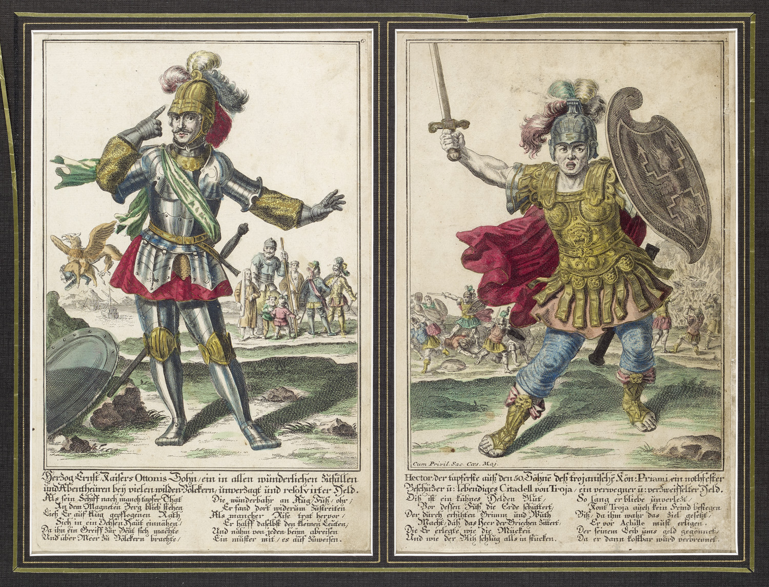 Paintings, drawings and prints 16th to 19th century – Each a hand-coloured copperplate engraving on handmade paper. 25.5 x 18 cm (33 x 21 cm). Each bears a typographical note regarding the imperial printing privilege. Each of the two sheets is mounted on backing board and fitted into a passe-partout. The paper has yellowed with age and has some stains, there are a few creases and some scuff marks. Overall in good condition. - A Baroque series featuring figures from ancient mythology, Germanic heroic sagas and medieval chivalric romances: Hector, Achilles, Siegfried, Duke Ernst, Olivier, Tristrand (Tristan), Pontus and Florenz. Each sheet depicts a dominant individual figure in Baroque armour, complemented by background scenes and two-column verse captions in cursive script. Given the imperial printing privilege noted on several sheets, the sheets were probably produced in Nuremberg, Augsburg or Frankfurt.