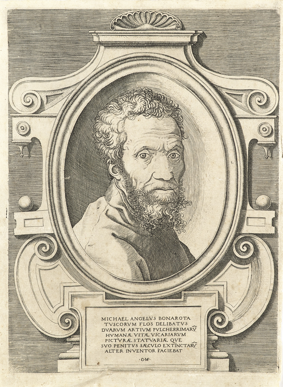 Paintings, drawings and prints 16th to 19th century – Copper engraving on handmade paper. With typographic inscription. The sheet shows slight browning and small, scattered brown spots due to age. The edge is partly bumped and slightly crushed, and has a small tear. Overall in good condition. An excellent, crisp print with a narrow margin. - After the portrait by Marcello Venusti. - A finely executed copperplate engraving depicting Michelangelo in an oval frame set against a richly ornamented architectural cartouche. The image of the bearded artist with an introspective gaze follows the iconography established in the 16th century and is part of the context of the heroisation of the artist as an 'uomo illustre', a concept shaped by Giorgio Vasari.