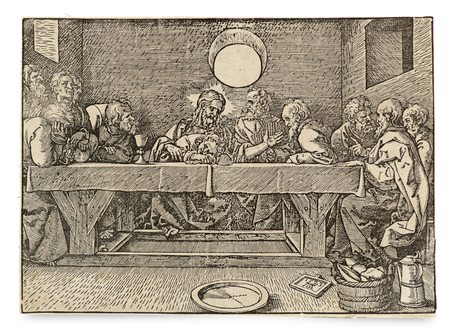 Gemälde, Zeichnungen u. Grafiken 16. bis 19. Jhd. – Vgl. Meder 1932, 164 a. Nach Albrecht Dürers Holzschnitt "Das letzte Abendmahl" von 1523. - Dürers Darstellung zählt zu den eindrucksvollen Holzschnittarbeiten seines Spätwerks und zeugt von seiner präzisen fein differenzierten Ausführung der Figuren. Die markante Hell-Dunkel-Wirkung verleihen dem Blatt eine hohe Präsenz und besondere Anschaulichkeit. - Leichte Oberflächenberiebungen, Ecken dezent bestoßen. Insgesamt gut. Kräftiger, intensiver Druck.