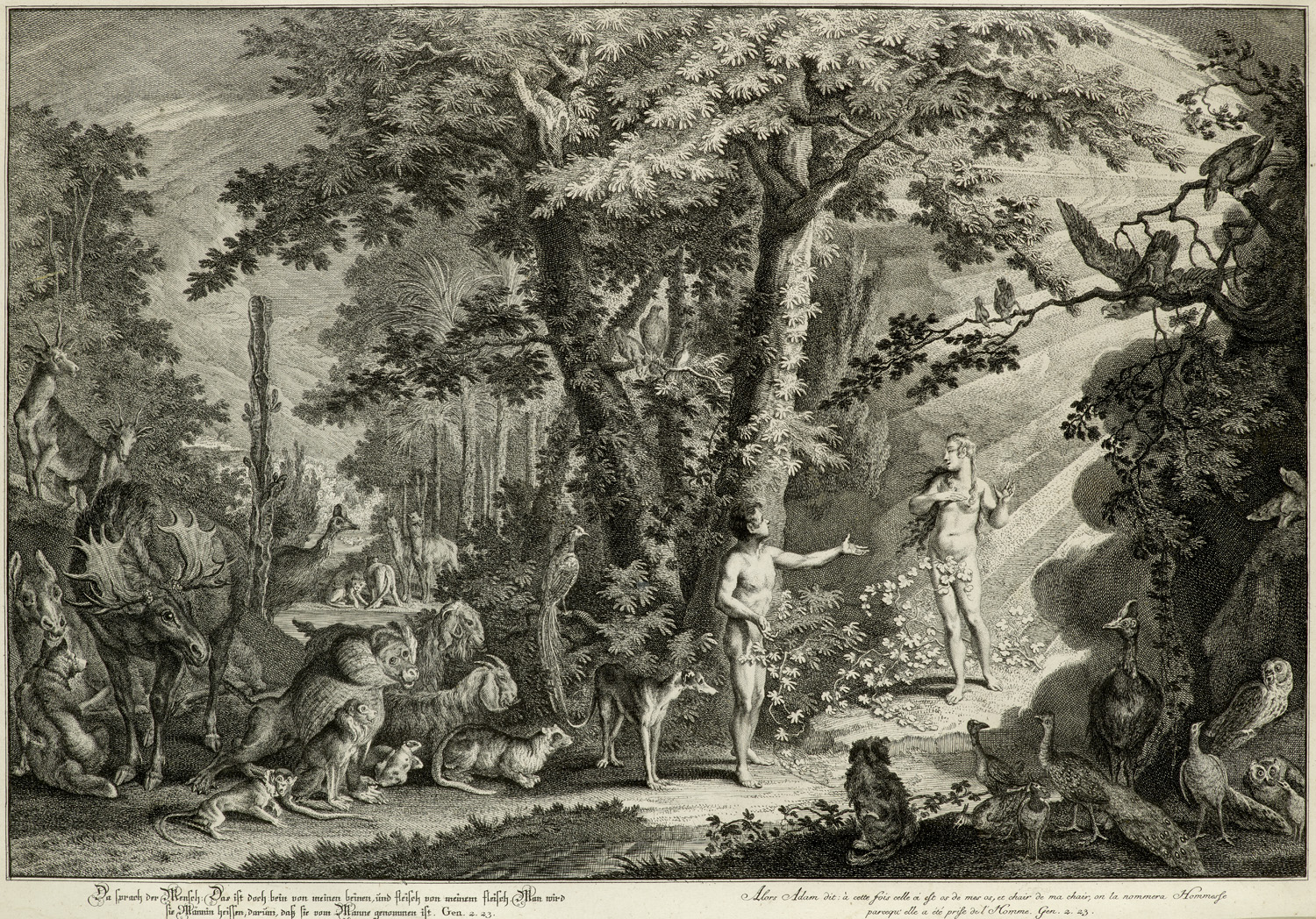Gemälde, Zeichnungen u. Grafiken 16. bis 19. Jhd. – Wvz. Thienemann 812, 815, 816. - Die Folge "Das Paradies oder die Schöpfung und der Sündenfall des ersten Menschenpaares" gehört zu den eindrucksvolleren religiös-allegorischen Bildserien im druckgraphischen Ouvre Johann Elias Ridingers. In 12 Blättern entfaltet sie die biblische Geschichte von der Erschaffung Adams und Evas bis zu deren Vertreibung aus dem Paradies. Die hier vorliegenden drei Blätter zeigen zentrale Szenen dieses Zyklus und verbinden die erzählerische Darstellung des Alten Testaments mit Ridingers charakteristischer, außerordentlich differenzierter Wiedergabe der Tierwelt. Unterhalb der Darstellungen finden sich jeweils mehrzeilige biblische Verse, in deutsch, französisch und latein.