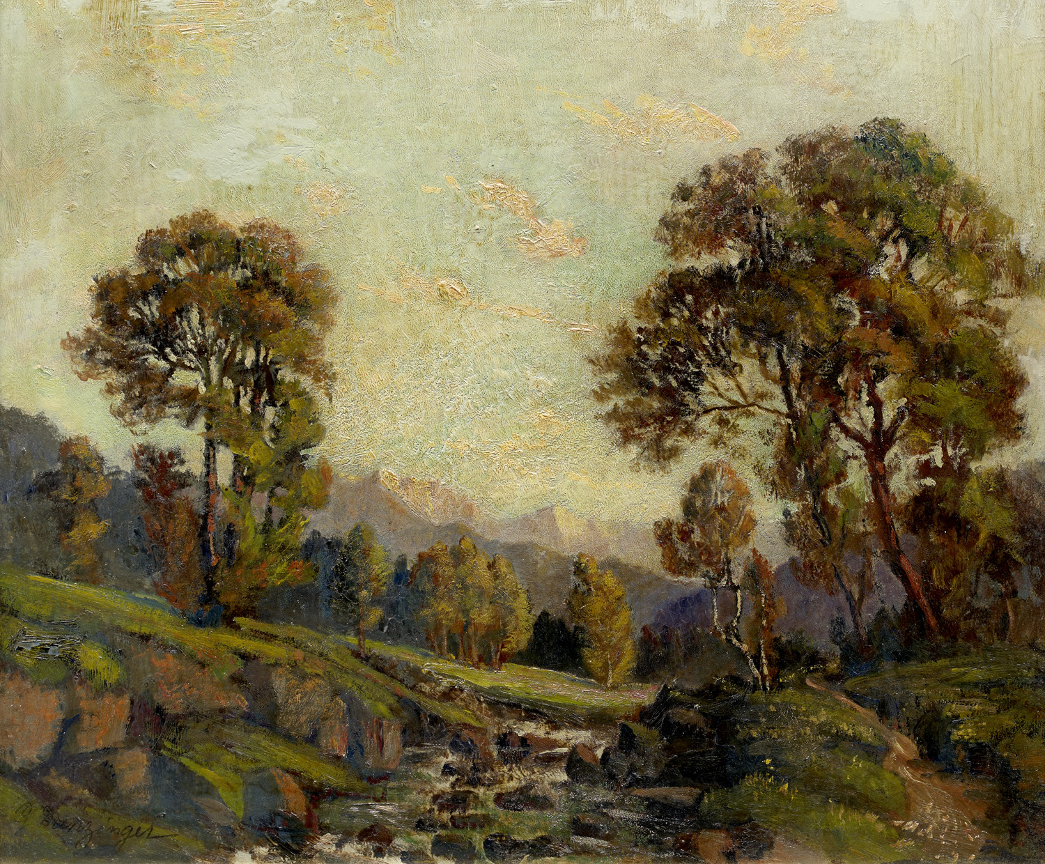 Herbstliche Landschaft mit Bachlauf. 1923. Öl auf Malkarton. 51,5 x 59,5 cm. Signiert, verso monogrammiert, datiert und gewidmet. Gerahmt. - Punktuelle Farbabplatzung unten links, ganz vereinzeltes Craquele, gegilbt, gefirnist, vereinzelte Retuschen unter UV-Licht erkennbar, verso stellenweise berieben, vereinzelte blasse Braunflecken. Insgesamt gut.