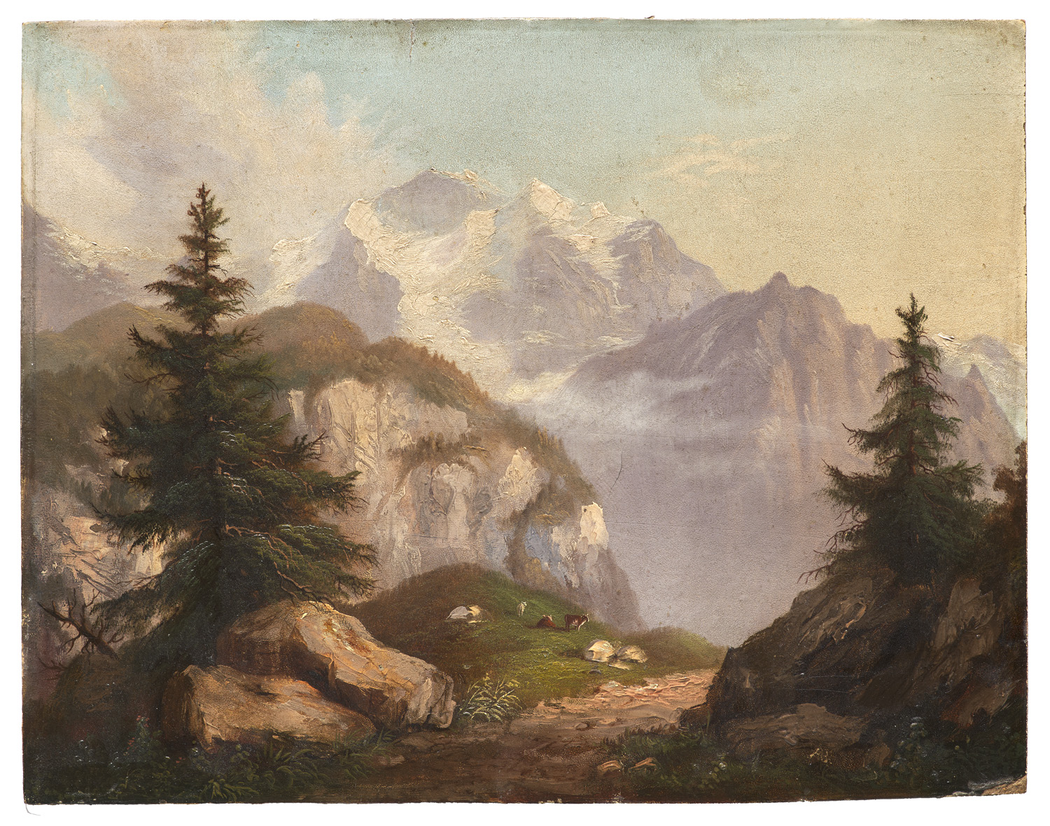 Bergansicht. 1830er Jahre. Öl auf Malkarton. 30 x 38 cm. Mit eingeritztem, legiertem Monogramm. Im goldfarbenen Holzrahmen gerahmt. - An den Kanten punktuell mit leichten Oberflächenbereibungen als Spur der Rahmung. Untere, rechte Ecke sowie sehr vereinzelt punktuelle Farbausbrüche. Stellenweise blasse, kleine Flecken, v.a. im oberen Bildbereich. Vereinzelt feines Craquelé. Oberfläche etwas angeschmutzt und Firniß angegilbt. Unter UV keine Retuschen erkennbar. Insgesamt gut. Romantische Landschaftsszene.