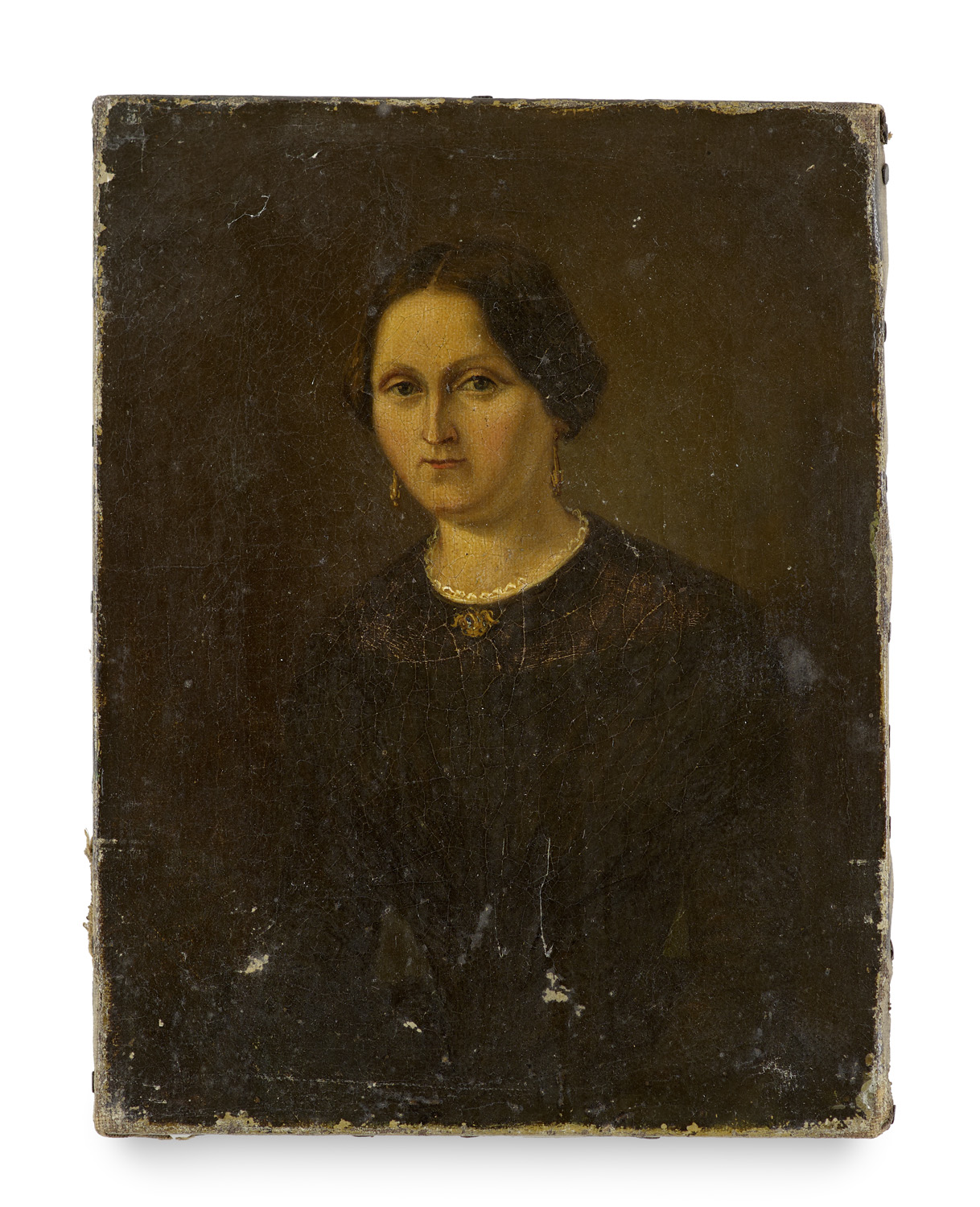 Portrait einer Frau im schwarzen Kleid. Öl auf Leinwand. 22,5 x 17 cm. - Stärkeres Craquelé, sowie partielle Farbabplatzungen und an den Rändern mit Abrieb. Gefirnist. Insgesamt gut.