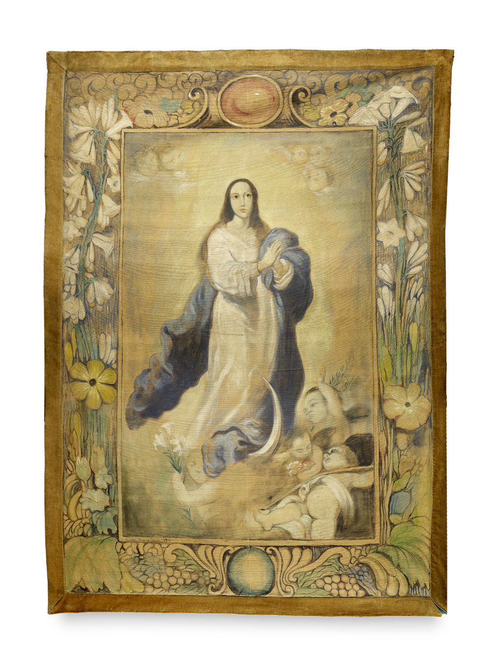 Paintings, drawings and prints 16th to 19th century – See Sedart Auction, February 16, 2022, Lot 101, for a similar religious textile work. - Oil on fabric. Signed and dated. Painted border along the edges with small dotted holes, partially worn due to the technique used. Overall in very good condition. - This large-scale fabric painting, dating from 1918, belongs to the early phase of Ismaël de la Serna's career and was created before he moved to Paris in 1921. It provides a striking illustration of his training within the Spanish painting tradition and its focus on classical models. Depicted is a Madonna of the Crescent Moon, surrounded by cherubs and iconographic attributes that refer to her religious significance. The softly modelled figures, the subdued, earthy colour palette and the overall harmoniously restrained composition lend the work a quiet, almost contemplative effect. At the same time, the work already points beyond the academic tradition. The increasingly free treatment of form and color, as well as the choice of an unusual support-a velvet fabric whose specific materiality is subtly incorporated into the painterly effect-point to a beginning shift away from academic rigor and a turn toward a more modern, independent conception of the image, incorporating Art Nouveau elements.