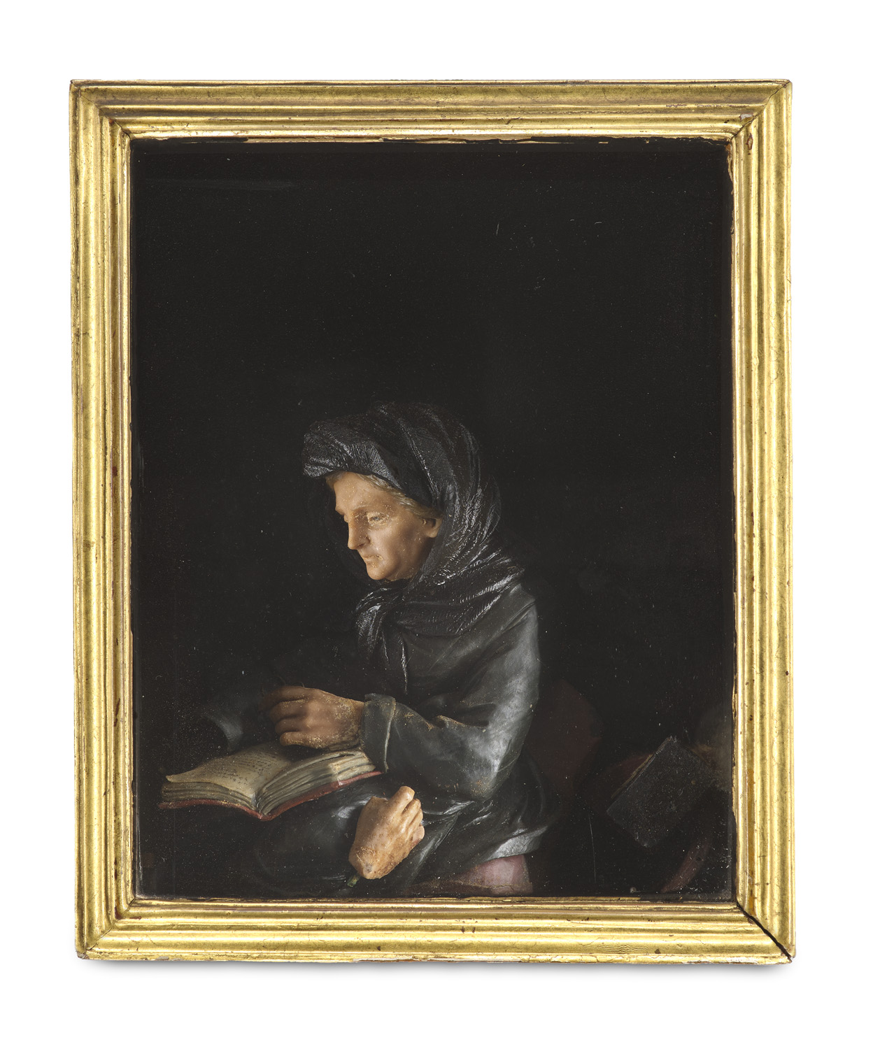 Die Großmutter. Um 1770-90. Relief. Wachsbossierung aus farbigem Wachs und Draht. In vergoldetem Holzkästchen unter Glas präsentiert (ungeöffnet). 23 x 19 cm.