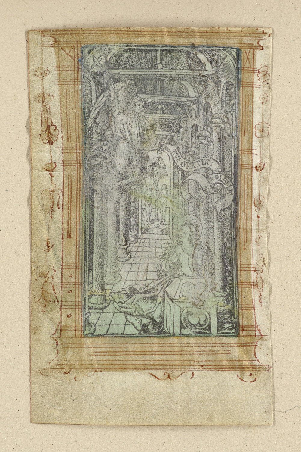 Verkündigung an Maria mit Darstellung des Sündenfalls. Ca. 1520. Metallschnitt auf Pergament. 15 x 9 cm. Verso mit lateinischem Text aus einer marianischen Liturgie ("De septem festivitatibus beatae Mariae virginis"), in gotischer Textura, rubriziert sowie mit farbiger Lombarde und floraler Bordüre, wohl aus einem liturgischen Codex.