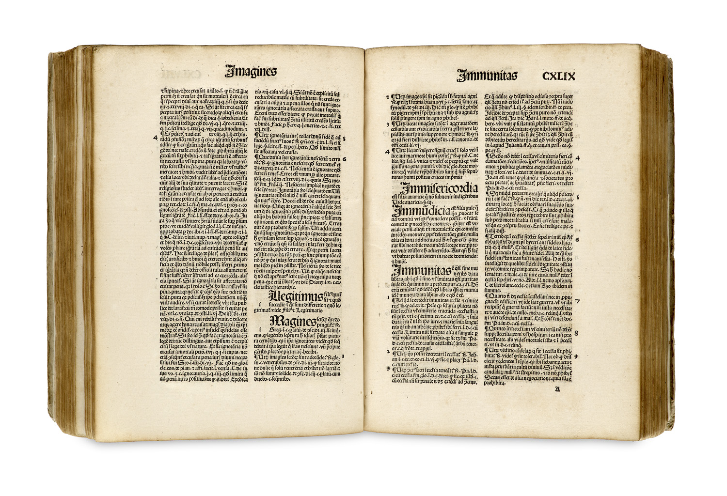 Prints before 1600, Bibles, Classics in Original Languages – Complete copy of the widely circulated devotional book (first published in 1486) in a rare, two-column Strasbourg post-incunabulum edition. Later paperback binding with handwritten title on spine (slightly rubbed and bumped). - The Summa angelica is one of the most important moral theological works of the late Middle Ages, arranged alphabetically. It was a practical, widely used handbook for confessors, influenced Catholic casuistry for centuries, and became a symbol of pre-conciliar moral theology. The popular encyclopedia was condemned by Luther as "Summa plus quam diabolica" and publicly burned in 1520 along with the papal law books. - Flyleaf and title page with two older (contemporary?) handwritten ownership notes, inner fold slightly broken, pages slightly browned and somewhat wavy, overall a nice copy.