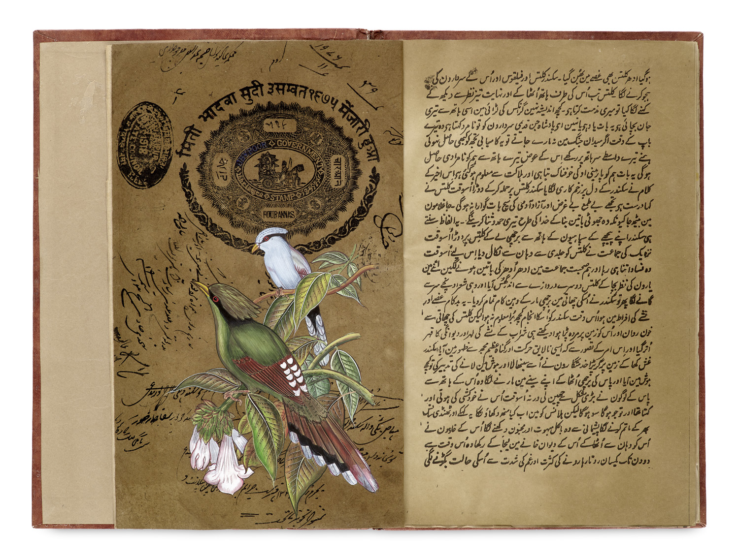 Manuskripte und Urkunden – Das Hamzanama erzählt die epischen Abenteuer von Hamza ibn Abd al-Muttalib, dem Onkel des Propheten Mohammed, der als unbesiegbarer Krieger gegen Feinde des Islams kämpft, Könige bekehrt und im mystischen Reich Qaf 18 Jahre lang gegen Dämonen und Zauberwesen streitet. Parallel dazu halten sein treuer Trickster-Gefährte Amar Ayyar und die geliebte Mihr Nigar auf Erden gegen Hofintrigen stand, während Hamza zwischen Heldenruhm, magischen Parallelwelten und Liebestreue hin- und hergerissen wird. Am Ende kehrt Hamza nach unzähligen Schlachten, dem Tod aller Gefährten und persönlichen Tragödien nach Mekka zurück, wo er im Dienst des Propheten fällt und als Märtyrer ins Paradies eingeht. Schwerpunkt ist heroische Jagd, also die Darstellung idealer männlicher Tugenden (Mut, Körperkraft, Reitkunst, Schutz der Gefährten). - Die Wiederholung ähnlicher Szenen mit unterschiedlichen Tieren (Tiger, Leopard, Antilopen) schafft eine Abfolge von Prüfungen, wie sie in epischen Dastans üblich ist. Die Feder wirkt wie eine saubere, aber nicht höfische Kopie (kein extrem feiner nastaliq" eines kaiserlichen Ateliers). Die im Manuskript enthaltenen Datierungen auf den braunen Schmutzblättern und ein britisch-indischer Stempel ("Government of India - Four Annas") deuten auf Nordindien in der späten Kolonialzeit hin.