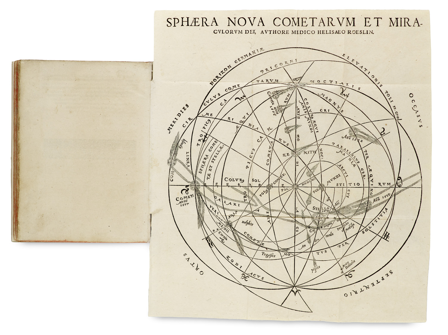 Prints before 1600, Bibles, Classics in Original Languages – Astronomy. - With woodcut printer's mark and fold-out woodcut star chart. (Strasbourg:) printed by Bernhard Jobin, 1578. 33 leaves (call no. A1-H5) Small 4°. Modern paper cover with slipcase, edges dyed red (rubricated). (In slipcase). - A very rare complete work on comets, which are regarded here as celestial bodies, only a single auction record is listed in RBH. Most library copies are missing the plate. Roeslin was one of five observers who concluded that the Great Comet of 1577 lay beyond the Moon. His depiction of the comet, described as 'an interesting, if crude, endeavour', was among the earliest and was extremely complex. Roeslin also independently came to the realisation that it is not the Earth, but the Sun, that is the centre of the solar system. First edition of Roeslin's first published work, with a fold-out star chart, the astronomer Helisaeus Roeslin (1545-1616) was one of the first to recognise that comets are celestial bodies and not atmospheric phenomena, and together with Raimarus Ursus and Tycho Brahe, he developed a geo-heliocentric planetary model. Helisaeus Röslin (1545-1616) was an Alsatian theologian, natural philosopher and astrologer, 'Theoria nova coelestium meteoron' is his first published work and marks the beginning of a small series of cosmological and meteorological treatises. - A fine copy.