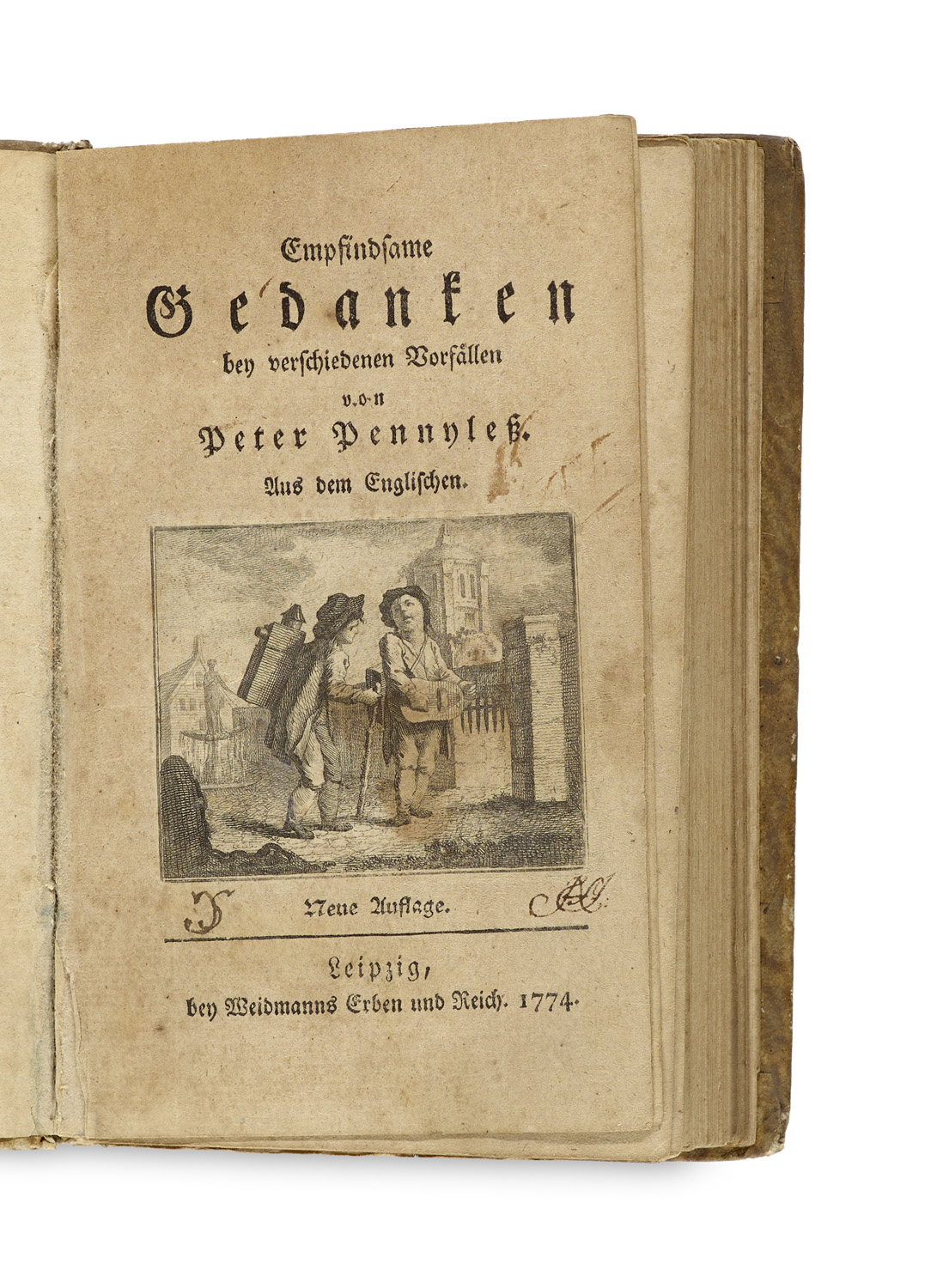 Empfindsame Gedanken bey verschiedenen Vorfällen. Aus dem Englischen. Mit gestochener Titelvignette. Leipzig, Weidmann und Reich, 1774. 1 Bl. (Tit.), 196 (2) S. Kl.-8°. Pbd. d. Zt. mit geädertem Kleisterpapierbezug u. hs. RTit. auf mont. Etikett (beschabt, etw. bestoßen).