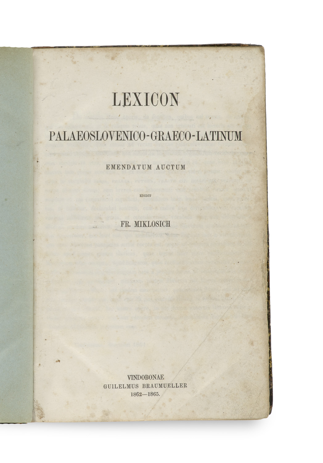 Literatur des 17. bis 19. Jahrhunderts – Maßgebliche zweite und letzte Auflage des grundlegenden Lexikons des Altkirchenslawischen. - Mares, F. W.: In: Wörterbücher. Ein internationales Handbuch zur Lexikographie. Hg. von F. J. Hausmann et al. 2. Teilbd., Berlin und New York 1990, S. 2262: - Von großer Seltenheit, für uns in den letzten 50 Jahren auf Auktionen nicht nachweisbar. - Lexikographisches Hauptwerk des Begründers der modernen Slawistik, Franz Miklosih (1813-91), "...das zweifellos beste existierende (alt-)kirchenslawische Wörterbuch" (...) "seit einem guten Jahrhundert ein Standardwerk der paläoslowenischen Studien" und "für Slawisten von großer Bedeutung und schlichtweg unverzichtbar" (...) "Darüber hinaus wird dieses Werk als vollständiges lexikographisches Werk (bis zum Ende des Alphabets) und als einziges Wörterbuch, das alle kirchenslawischen Varianten (einschließlich des Altrussischen) berücksichtigt, seinen Wert behalten unmit älterer fachkundiger Restaurierung, Einband leicht berieben, erste und letzte Seiten stellenweise leicht fingerfleckig und minimal wasserrandig, insgesamt gut erhaltenes Exemplar dieses seltenen und gesuchten (und daher auch mehrfach nachgedruckten) Titels.