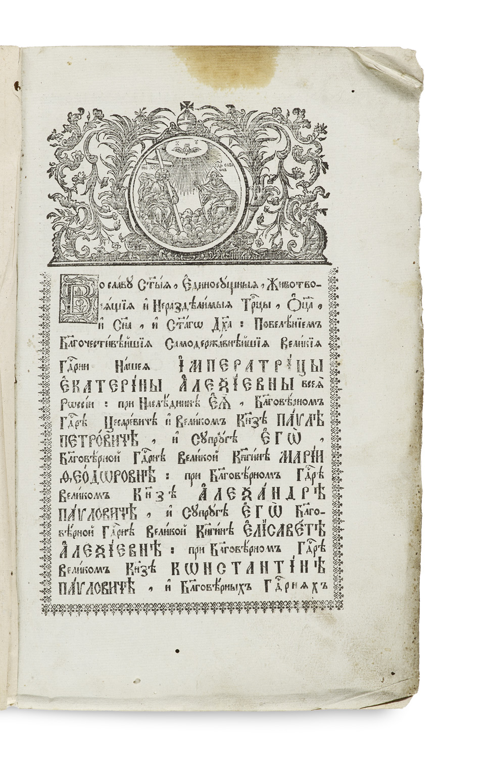 Dejanija zerkownye i grashdanskie ot Roshdestwa Christowa do polowiny pjatnadzatogo stoletija. (Kirchliche und zivile Ereignisse von der Geburt Christi bis zur Mitte des 15. Jahrhunderts). 2 Tle. (v. 3) i. e. Bd. Aus dem Mittelgriechischen ins Kirchenslawische von Ioann Ioannowitsch Sidorowskij. Mit 6 illustrierten bzw. ornamentalen Holzschnitt-Vignetten. Moskau, Druckerei der Synode, Nov. 1794. 2 nn Bll. (Titelbl., Widmungsbl.), 200 Bll. u. 1 nn. Bl. (Zwischentit.), 228 Bll. Folio auf weißem und voluminöserem minzgrünem Papier. Ldr. d. Zt. auf sechs falschen Bünden über Kartondecken mit floral ornamentiertem RTit. in Blindpräg. und handschriftlichem Titelschild (an den Ecken und Kanten bestoßen, an den Kapitale und Gelenken eingerissen, berieben und fleckig, erste 3 Blatt lose).