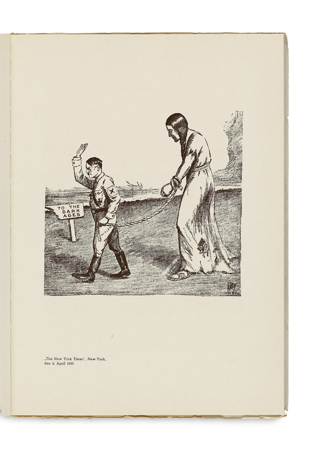Hitler in der Karikatur der Welt. Tat gegen Tinte. Mit über 70 Karikaturen. Berlin, Verlag Braune Bücher Carl Rentsch, 1933. 174 S., 1 Bl. 4°. Pp. mit mont. Umschlag mit DTitel (stärker berieben und bestoßen, Rücken gelöst).