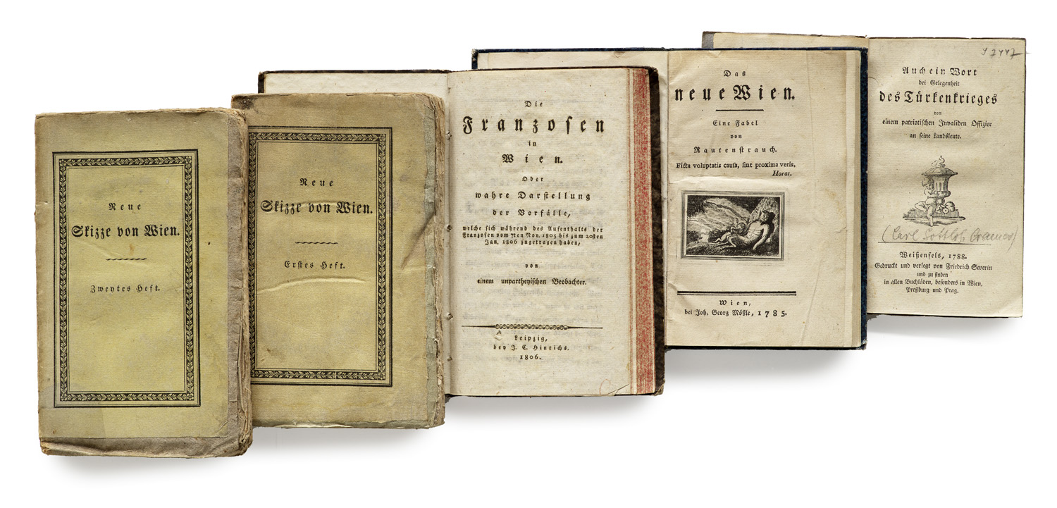 Geschichtswissenschaften – Enthält: 1. (Rautenstrauch, Johann): Der Teufel von Wien. Eine nächtliche Fantasie von Salzmann. Mit gestochener und zusätzlich radierter Titelvignette, einigen Vignetten und Zierrat im Holzschnitt. Wien, Hartel, 1783. 84 S. Kl.-8°. Interimsbr. d. Zt. (Rücken mit kl. Fehlstellen, fleckig). - Selten, diese Ausgabe nicht im VD18. - Titelei mit hs. Einträgen, etw. stock-, braun- und fingerfleckig, teils mit Eselsohren. - 2. Rautenstrauch, Johann: Das neue Wien. Eine Fabel. Mit gestochener und zusätzlich radierter Titelvignette und Zierrat im Holzschnitt. Wien, Mösle, 1785. 75 (1) S. Kl.-8°. HLn. d. ausg. 19. Jh. mit goldgepr. RTit., die Deckel mit geädertem Marmorpapier bezogen (etw. bestoßen und berieben). - Erste und einzige Ausgabe dieser literarischen Utopie über Wien in 20 Jahren im Jahr 1805. - Selten, nicht im VD18. - Vorderspiegel mit Etikett einer Privatbibliothek, minimal fingerfleckig und gebräunt. - 3. Cramer, Carl Gottlieb: Auch ein Wort bei Gelegenheit des Türkenkrieges von einem patriotischen Invaliden Offizier an seine Landsleute. Mit Titelvignette im Holzschnitt. Weißenfels, Severin, 1788. 67 (1) S. Kl-8°. Spät. Br. (fleckig, mit Randeinrissen und Lichtrand). - Erste und einzige Ausgabe der anonym erschienenen Schrift. - Holzmann-Bohatta I, 2366. - Sehr selten, nicht im VD18, nicht bei Wernigg und Goedeke. - Aufruf zum Kampf gegen die Osmanen und Bekenntnis zu Joseph II. - Vorderer Vorsatz mit hs. Einträgen, etw. gebräunt. - 4. Pezzl, Johann: Neue Skizze von Wien. 2 Hefte in 2 Bänden. Wien, Degen, 1805. 1 Bl. (Tit.), Ss. 1-180 (2, Inhaltsverz.) S. und 1 Bl. (Tit.), Ss. 182-363 (3, Inhaltsverz., Verlagsanz.) S. OKart., bezogen mit orig. gelbem Umschalgpapier, dieses mit lithogr. Tit. (berieben, etw. fleckig u. angestaubt). - Erste Ausgabe der anonym erschienenen Schrift. - Holzmann-Bohatta IV, 2776. - GV 135,248. - Selten. - Provenienz: 1. Fred. Isenschmid. 2. Hermann Mühlberger, je mit Ex Libris montiert auf den Innenseiten der vorderen Umschläge. - Stellenweise leicht stockfleckig, sonst gut erhalten, unbeschnittenes Exemplar in den seltenen originalen Kartonagen. - 5. Die Franzosen in Wien. Oder wahre Darstellung der Vorfälle, welche sich während des Aufenthaltes der Franzosen vom 7ten Nov. 1805 bis zum 20sten Jan. 1806 zugetragen haben, von einem unpartheyischen Beobachter. Leipzig, Hinrichs, 1806. IV, 169 (1). Kl.-8°. Pbd. d. Zt. mit hs. RTit. auf Papierschild, bezogen mit geädertem Kleisterpapier (beschabt u. etw. bestoßen). - Erste und einzige Ausgabe der anonymen Schrift. - Nicht bei Holzmann-Bohatta. - Provenienz: Vorderspiegel mit "Ex libris Friderici Goldschmidtii Viennensis", Hintespiegel mit Etikett "Ex Bibliotheca F. W. Goldschmidt". - Etw. gebräunt, sonst sauber.