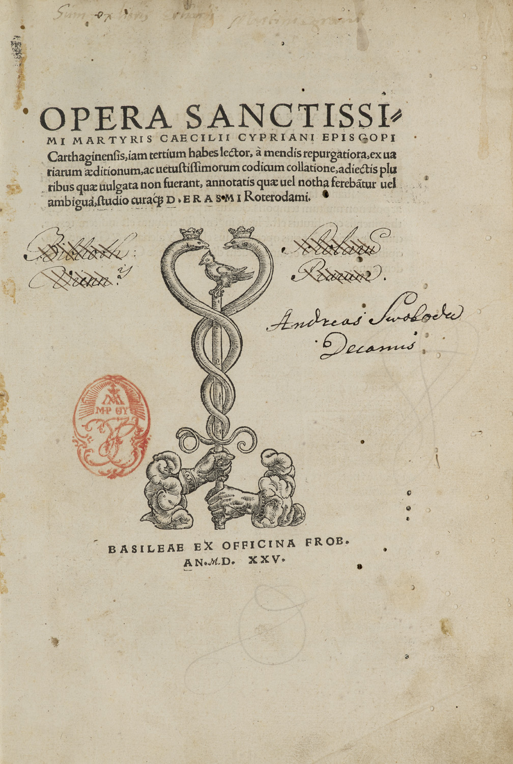 Opera Sanctissimi Martyris Caecilii Cypriani Episcopi Carthaginensis Iam tertium lector, a mendis repurgatiora ex variarum aeditionum, ac vetustissimorum codicum collatione, adiectis pluribus quae vulgata non fuerant, annotatis quae vel notha ferebatur vel ambigua, studio curaque D. Erasmi Roterodami. Mit Druckermarke auf Titel u. l. S. sowie mehr. figürlichen Holzschn.-Initialen. Basel, Froben, 1525. 12 Bll., 507 S., 14 Bll. Folio. Restaur. Ldr. d. Zt. mit reicher RVerg. u. mod. RSchild.