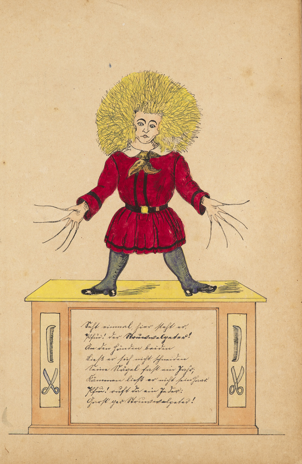 Kinderbücher – Manuskript nach Hoffmann. - Vorwort abgeändert. - Der gebürtige Frankfurter Heinrich Hoffmann verfasste die Geschichten, welche später zusammengefasst unter dem Titel Struwwelpeter veröffentlicht wurden, zunächst nur als Weihnachtsgeschenk für seinen Sohn. Der Verleger Zacharias Löwenthal erkannte jedoch den Wert in den Geschichten und überzeugte Hoffmann, diese zu veröffentlichen. Die erste Auflage erschien im Jahr 1845 unter dem Titel "Lustige Geschichten und drollige Bilder", ab 1847 trug es dann den Titel "Struwwelpeter". - Die Seiten des Manuskripts bestehen aus fester Pappe. Die kunstfertigen Illustrationen mit Tusche gezeichnet und in leuchtenden Farben koloriert. - Ränder und Ecken griffspurig. Teils stockfleckig und wasserfleckig. Ränder gebräunt. Illustrationen in kräftiger Farbe. Insgesamt gut erhalten.