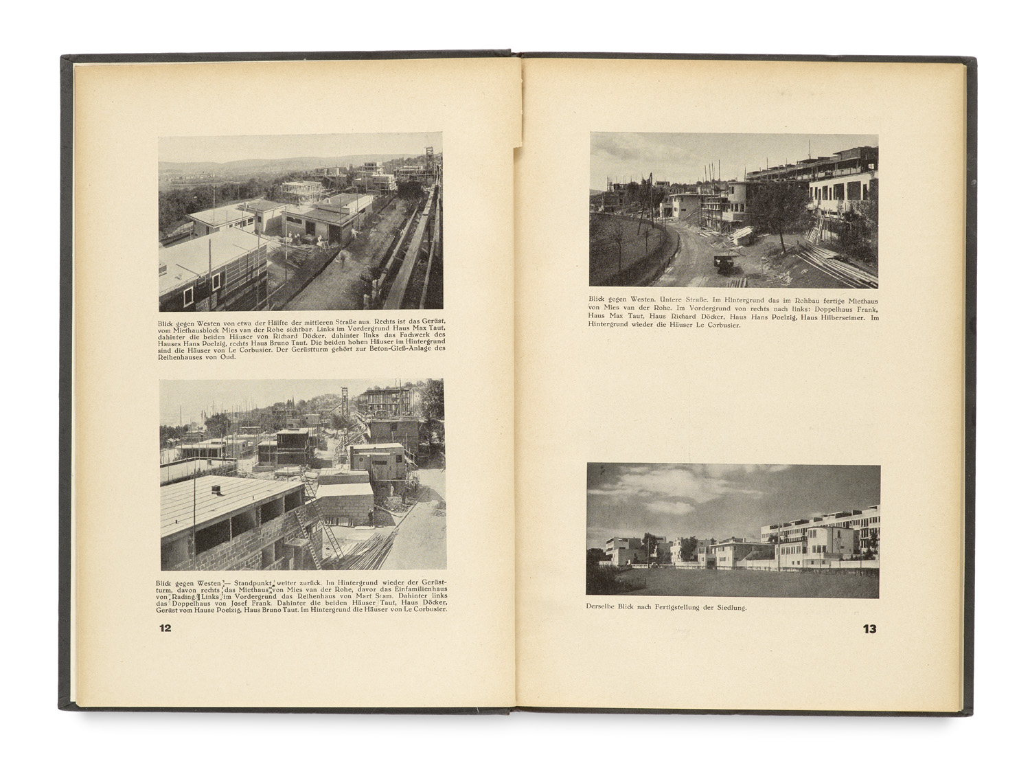 Wie Bauen? Bau und Einrichtung der Werkbundsiedlung am Weißenhof in Stuttgart 1927. Vorwort von A. Behne. Mit zahlreichen Abbildungen. Stuttgart, Wedekind, 1928. 4°. 176 Seiten. Orig.-Leinwand mit goldgeprägtem Deckeltitel (Titelbuchstaben mit kleinen Abschabungen).