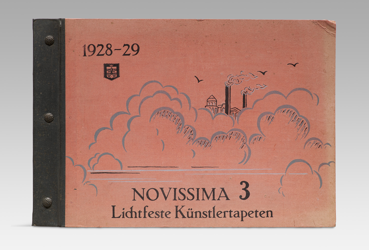 Novissima 3. Lichtfeste Künstlertapeten. Mit 84 pochoirkolorierten Tapetenmustern auf Tafeln jew. mit zusätzl. montierten Borden, sowie 10 photographischen s/w Abbildungen weiterer Muster. O. O. (Aarau), Selbstverlag 1928. 85 Bl. Tapetenpapier u. 10 Bl. w. Hochglanzpapier. Quer-Folio (ca. 33 x 47 mm). HLn.-Schraubenbindung mit illustriertem, pochoirkoloriertem DTit. unter Verwendung des Firmenzeichens (mit kl. Stockfleckchen, etw. lichtrandig und fleckig, die Ecken gering bestoßen).