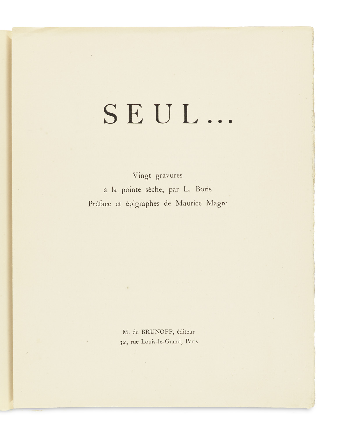 Seul ... Préface et épigraphes de Maurice Magre. 20 Tafeln mit Kaltnadelradierungen. Paris, Brunoff, 1921. 4 Bll. (Vortit., Tit., Druckverm., Vorw.), 20 Taf. Gr.-4°. Orig. franz. Br. mit kalligraphiertem lithographischem DTit. (mit Lichtrand, etwas gebräunt, mitunter leicht finger- und stockfleckig).