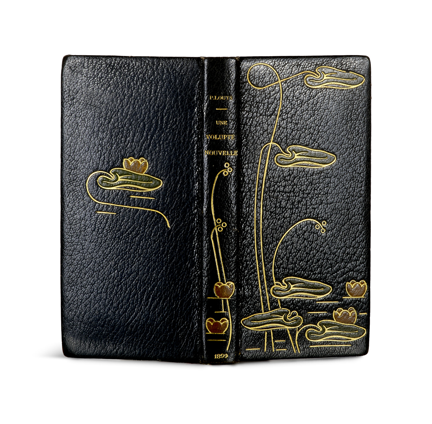 Modern Literature and Art – With over 60 erotic vignettes. Paris, Borel, 1899. Olive green full morocco binding with leather inlays (á la mosaiquée) with leather doublure and brocade silk endpapers. Signed E. Contier. - Une volupté nouvelle, published in 1899 by Borel in Paris with over 60 erotic vignettes, is an erotic novella by French author Pierre Louys. In it, the ancient nymph Callistô, whose ancient tomb stands in the Louvre, awakens to nocturnal life in modern Paris and discovers new sensual pleasures with the narrator. The story contrasts the supposed decadence of modernity with the ancient world, with Callistô criticizing modern culture as imitative and uninspired - "nothing new under the sun" - amid erotic adventures. The work combines Louys' typical themes of sensuality, antiquity, and satire in a limited, illustrated edition.