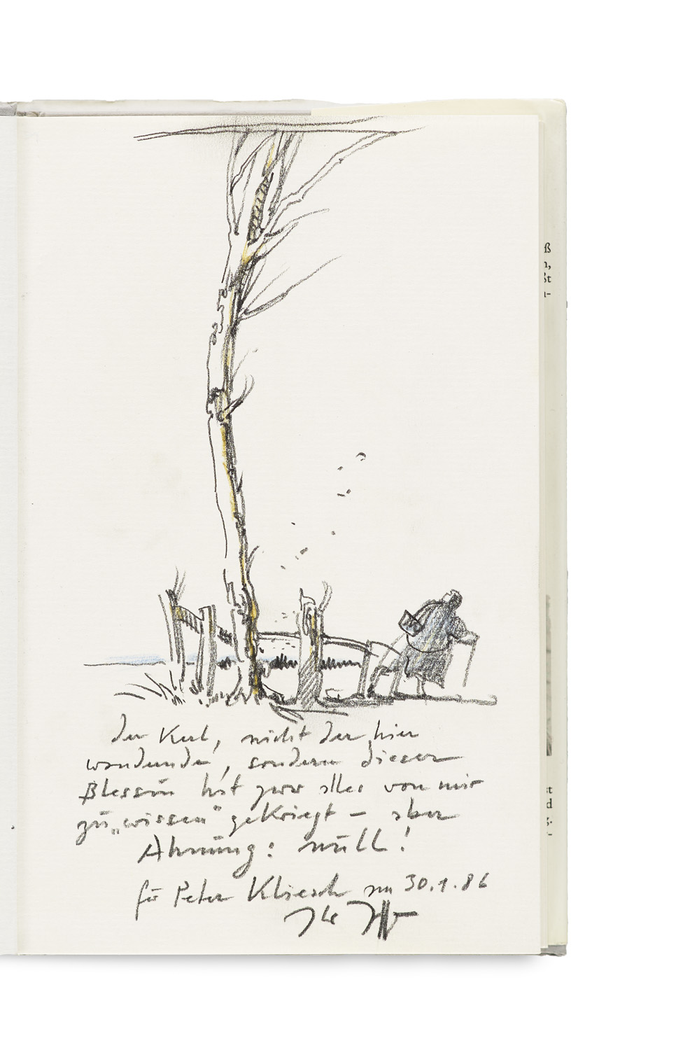 Moderne Literatur und Kunst – Erste Ausgabe. - Mit eigenhändiger Farbstiftzeichnung von Horst Janssen auf Vorsatz, mit längerer Widmung, signiert und datiert 30.1.86.