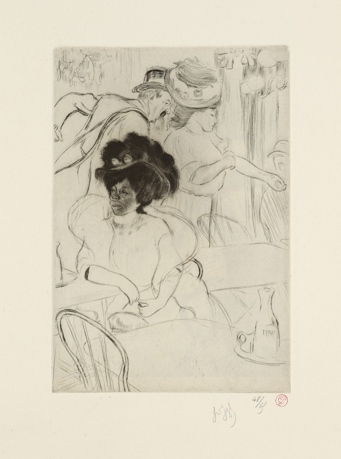 Moderne Literatur und Kunst – Legrand. Catalogue Raisonné, 189. - Monod 7058. - Sehr selten. Kein Exemplar für uns weltweit im Handel derzeit nachweisbar. - Eins von 65 Exemplaren. - Prachtvolle Mappe mit der berühmten Folge Les Bars die Bars, Cafés und Trinklokale des Pariser Nachtlebens vereint. Sie gehört zu den wichtigsten Zyklen Legrands, in denen er Milieus der Belle Époque - Alkohol, Prostitution, Sport- und "English bars" - mit einem zwischen Empathie und beißender Ironie changierenden Blick festhält. Die Mappe wurde von Legrands Stammverleger Gustave Pellet in Paris publiziert. Alle Blätter sind in Kaltnadel bzw. Radierung ausgeführt und tragen den roten Pellet-Verlagsstempel (Lugt 1193) sowie teils das Wasserzeichen "Pellet et Legrand". Legrand nutzt die Kaltnadel, um einen samtigen, tiefen Schwarzton zu erzeugen, der durch den Grat (Burr) an der Plattenkante entsteht und den Szenen ein rauchig-dunkles, fast nebelhaftes Ambiente verleiht. Die Linien sind oft nervös und skizzenhaft, wodurch Bewegung und Unruhe in den engen Barinterieurs sichtbar werden: Körper, Möbel und Rauchschwaden scheinen leicht zu flirren, was die Flüchtigkeit des Moments betont. Legrand steht in der Tradition des französischen Fin-de-Siècle-Graphikers (Félicien Rops, Toulouse-Lautrec), überträgt diese jedoch auf ein breiteres soziales Spektrum. Wohlerhalten.