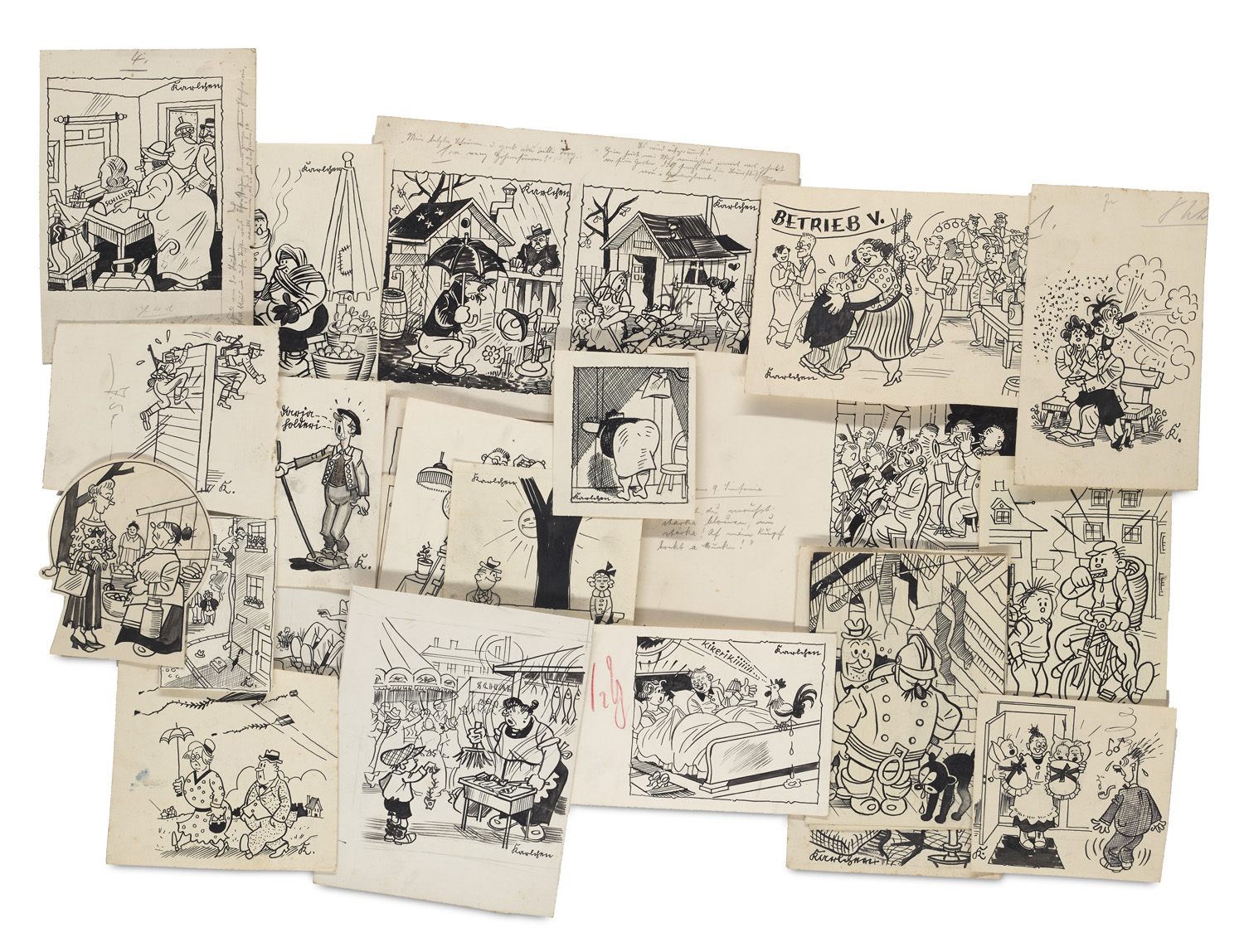 Sammlung von ca. 220 karikaturistischen Zeichnungen. Schwarzer Faserstift und schwarze Tinte auf Karton. 1930er Jahre. Versch. Formate von ca. 9 x 7,5 cm bis 15,5 x 23 cm.