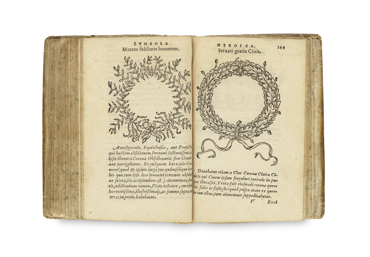 Prints before 1600, Bibles, Classics in Original Languages – With a woodcut vignette on the title page and 216 emblematic woodcut illustrations. Complete first Latin edition. - Extremely rare. According to WorldCat, we have only been able to locate it in 6 institutions worldwide. Only two auction results. - Not listed in VD16. - Not listed in Adams. - Landwehr Emblem Books Low Countries, 468. - First Latin edition of the emblem book originally published in France in 1551 without text and in 1557 with text. As an early Plantin edition of one of the most influential emblem books of the early modern period, this print ranks among the key works of European emblematics. The volume is significant for the history of books and art because it demonstrates the interplay of letterpress typography, woodcut illustration and humanist symbolic language at a high technical and conceptual level. - Partially with handwritten markings. Pagination not consecutive from folio 144 onwards. Last pages with tears, marginal discolouration, some with heavier staining. Overall, a well-preserved copy of this very rare book of emblems.