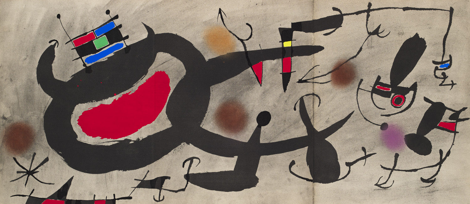 Modern Literature and Art – With 4 pochoirs by D. Jacomet after Miró (incl. cover), 1 of which as a triptych, a mounted colour plate and two mounted sandpaper plates. Illustrated original brochure in ill. Original illustrated wrappers (somewhat creased at edges, wrappers light-stained). - One of 1200 numbered copies on vélin d'Arches. - Published on the occasion of the exhibition of the same name. - Slightly browned due to paper. Reproductions in brightly coloured condition.