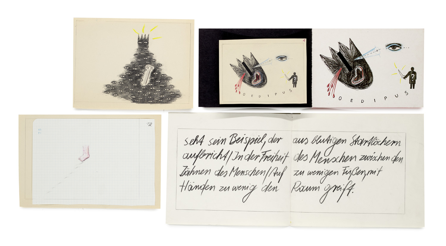 Moderne Literatur und Kunst – Publikation des schauspiel Köln zur Aufführung von Oedipus von Sophokles nach der Übertragung von Friedrich Hölderlin. Die Inszenierung kam von Jürgen Gosch und das Bühnen- und Kostümdesign von Axel Manthey. Der Text Müllers stammt aus Mauser, Rotbuch 184, Berlin 1978. Hier mit drei Originalzeichnungen, welche auch in dem Heft abgebildet sind. - Einige Seiten lose. Insgesamt gut erhalten. - Dabei: Flyer zur Aufführung im Schauspuelhaus Köln. - A. W: Mytze. Europäische Ideen. Dramatik in der DDR 1. Heft 13. Berlin, 1975. 8°. Broschur. - C. Neher. Der Zerrissene. Mit den Illustrationen von Caspar Neher. Wien, Gottfried von Einem, 1964. Quer-4°. Broschur.