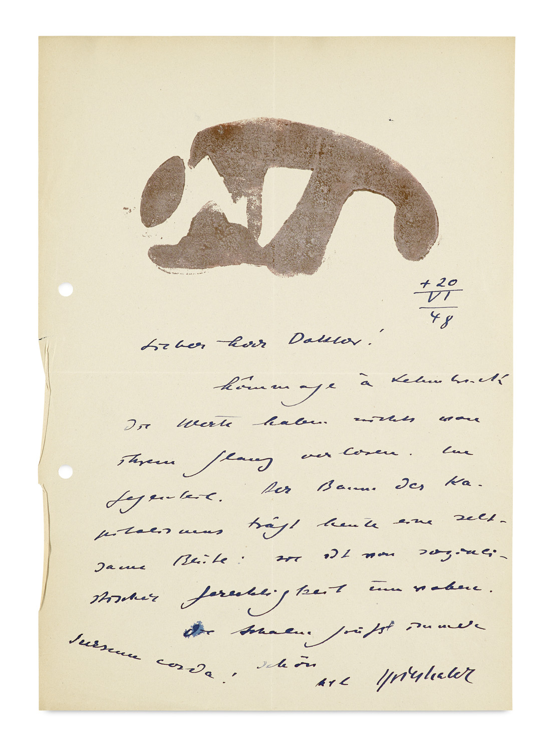 Autographs – Letter from Grieshaber to gallery owner Herbert Herrmann with an original drawing. - Short letter from the artist HAP Grieshaber to gallery owner Herbert Herrmann. Herrmann owned a gallery in Stuttgart. Above the letter is a small original drawing by Grieshaber. - Edges browned, minor edge wear. Overall in good condition.