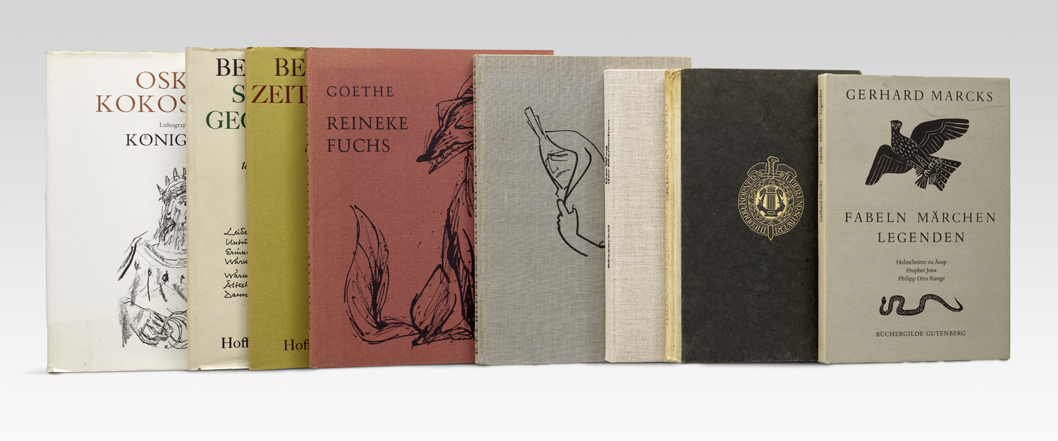 Moderne Literatur und Kunst – Vom Künstler im Druckvermerk signiert. - Die Lithographien auf Büttenkupferdruckpapier gedruckt. Umschlag und Vorsatz unter Verwendung von Bugra-Buttenpapieren hergestellt. - Dabei 8 illsutr. bzw. biblioph. Werke. - Vorh.: O. Kokoschka, Lithographien zu Shakespeare, König Lear. Luzern 1971. 4°. OLwd. im OU. - F. Masereel, Der Weg der Menschen. 60 Holzschn. Ffm. 1968. 4°. OLwd. - Hoffmann, E.T.A., Das Fräulein von Scuderi. Ill. J. Hegenbarth. Köln 1958. 4°. OLwd. - G. Marcks, Fabeln, Märchen, Legenden. Holzschn. Ffm., 1988. 4°. OPp. im OU. - E. O'Neill, The Iceman Cometh. Ill. by L. Baskin. New York (Lim. Ed.) 1982. 4°. OPp. - G. de Beauclair, Zeit Überzeit. Hbg. 1976. OPp. im OU. (Sign.) - Ders., Sang im Gegenwind. Hbg. 1983. OPp. im OU. - Th. Körner, Leier und Schwert. Ganymedes-Presse 1913. 4°. OHPgt. (Schnitt, Rücken u. 3 Bll. braunfl.). - Bretonne, R.d.l., Das Leben meines Vaters. Mit Lithos von H. Richter. Berlin 1972. 2°. OLwd. Serie B, 1000 sign. Expl. - Becher, U., Franz Patenkindt. Linolschn. v. W. Jörg u. E. Schönig. Berl. Handpresse 1979. - Singer, I.B., Der Tod des Methusalem. Ill. von K.-G. Hirsch. 1992. OPp. - 2 Beigaben.